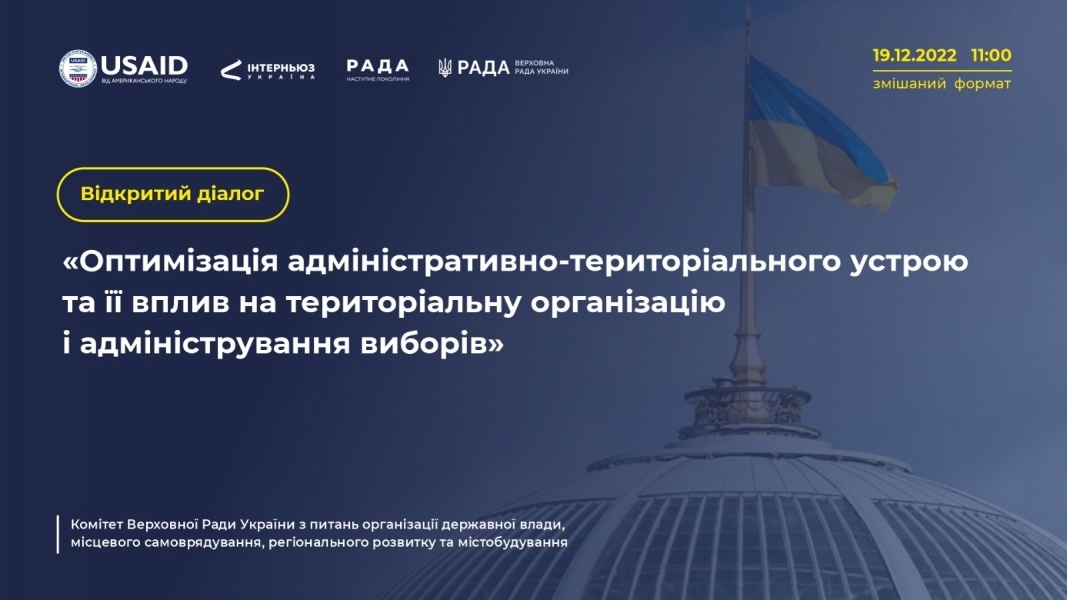 Парламентський Комітет з питань організації державної влади, місцевого самоврядування, регіонального розвитку та містобудування 19 грудня проведе відкритий діалог на тему: «Оптимізація адміністративно-територіального устрою та її вплив на територіальну організацію і адміністрування виборів».