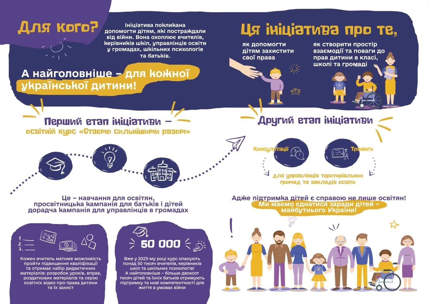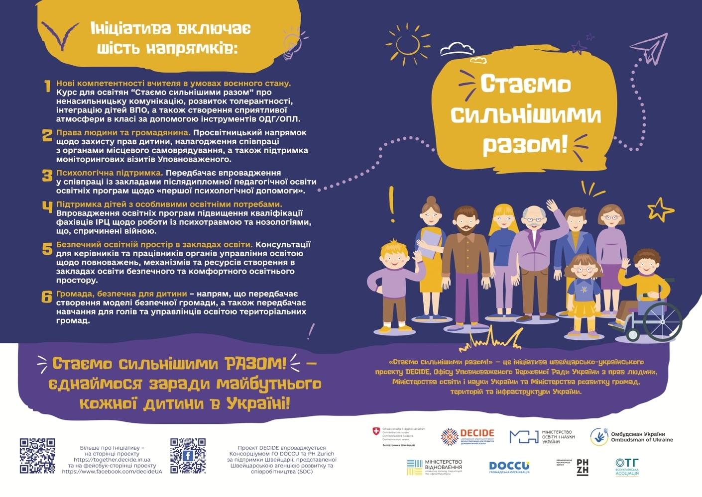 «Стаємо сильнішими разом!» – ініціатива швейцарсько-українського проєкту DECIDE спільно з Офісом Уповноваженого ВРУ з прав людини, МОН, Мінвідновлення і Фондом Президента України з підтримки освіти, науки та спорту. Вона спрямована на вчителів, керівників закладів освіти, шкільних психологів, батьків, голів територіальних громад і працівників органів управління освітою тергромад. А головне – на кожну українську дитину.