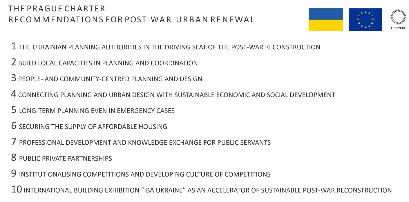 The success of reconstruction depends on improving and creating a new quality of life, increasing the capacity of local authorities, establishing connections, and providing a unique quality of services. The main priorities, the achievement of which is a criterion for the success of reconstruction, were formed by international and Ukrainian experts (Anna Bondar Ukrainian National Parliament, Kees Christiaanse KCAP, Lidiia Chyzhevska the National Union of Architects of Ukraine, Gyler Mydyti KCAP, Petr Navrat ONplan Lab, Otar Nemsadze GIZ Georgia & Tbilisi Architecture Biennale, Haris Piplas Drees&Sommer, Robert Youssef ONplan Lab) during the conference in Prague.