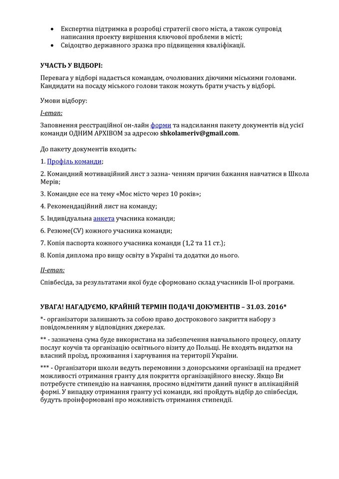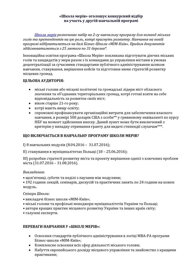 25 лютого 2016 року стартував набір до другої Школи мерів. Минулого року успішно пройшла перша школа. Вона підготувала нових лідерів для місцевих громад України. У ході реформи децентралізації перед очільниками місцевих органів влади постав ряд нових завдань: вміння підготувати інвестиційні проекти, вміти залучити фінансування та інвестиції у громади, сформувати її бюджет. Це ті знання та навички, якими не володіли місцеві керівники раніше, адже усі рішення приймалися у Києві, і у таких якостях не було необхідності. Таку думку висловив Геннадій Зубко, віце-прем’єр-міністр, міністр регіонального розвитку, будівництва та житлово-комунального господарства України.