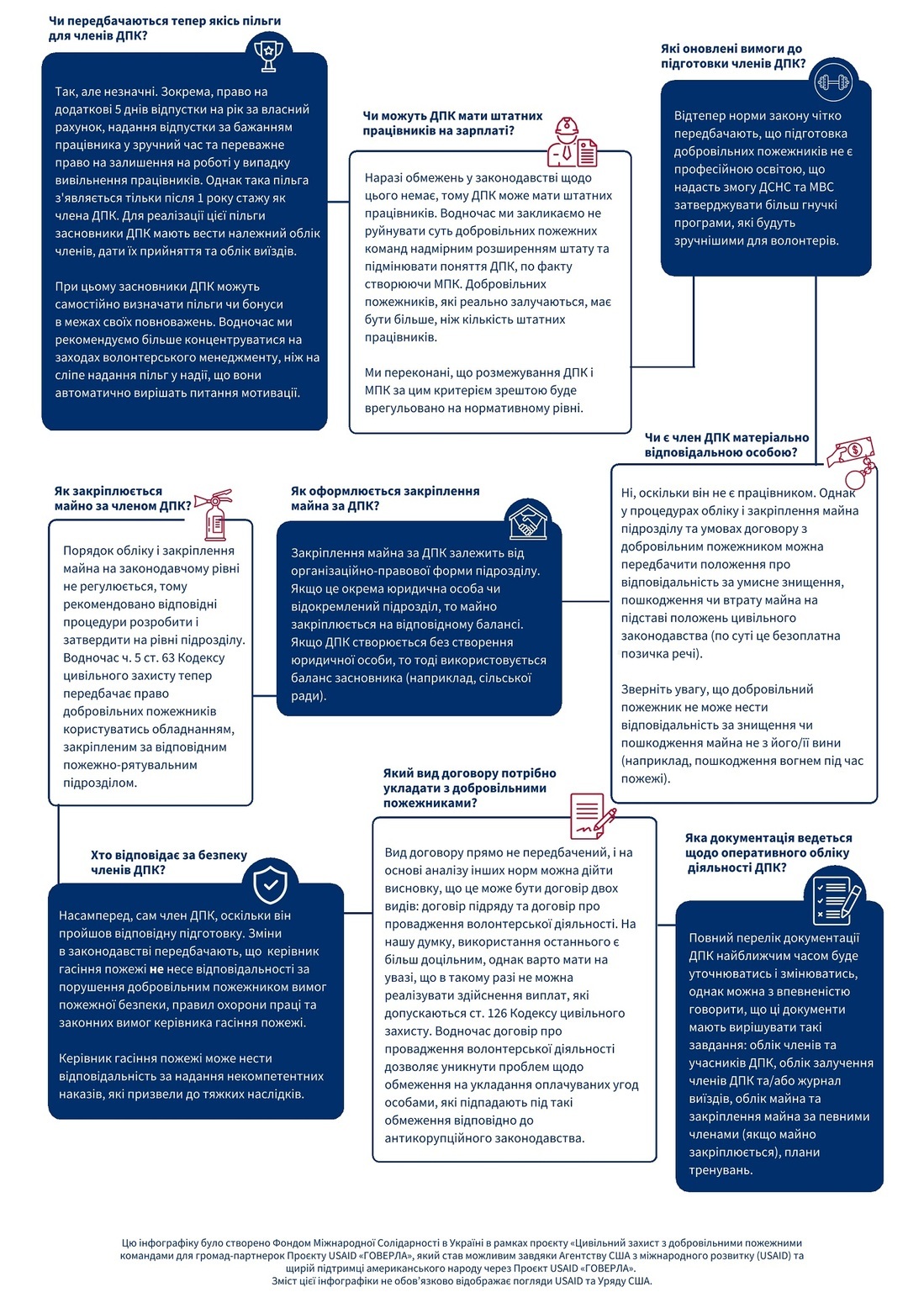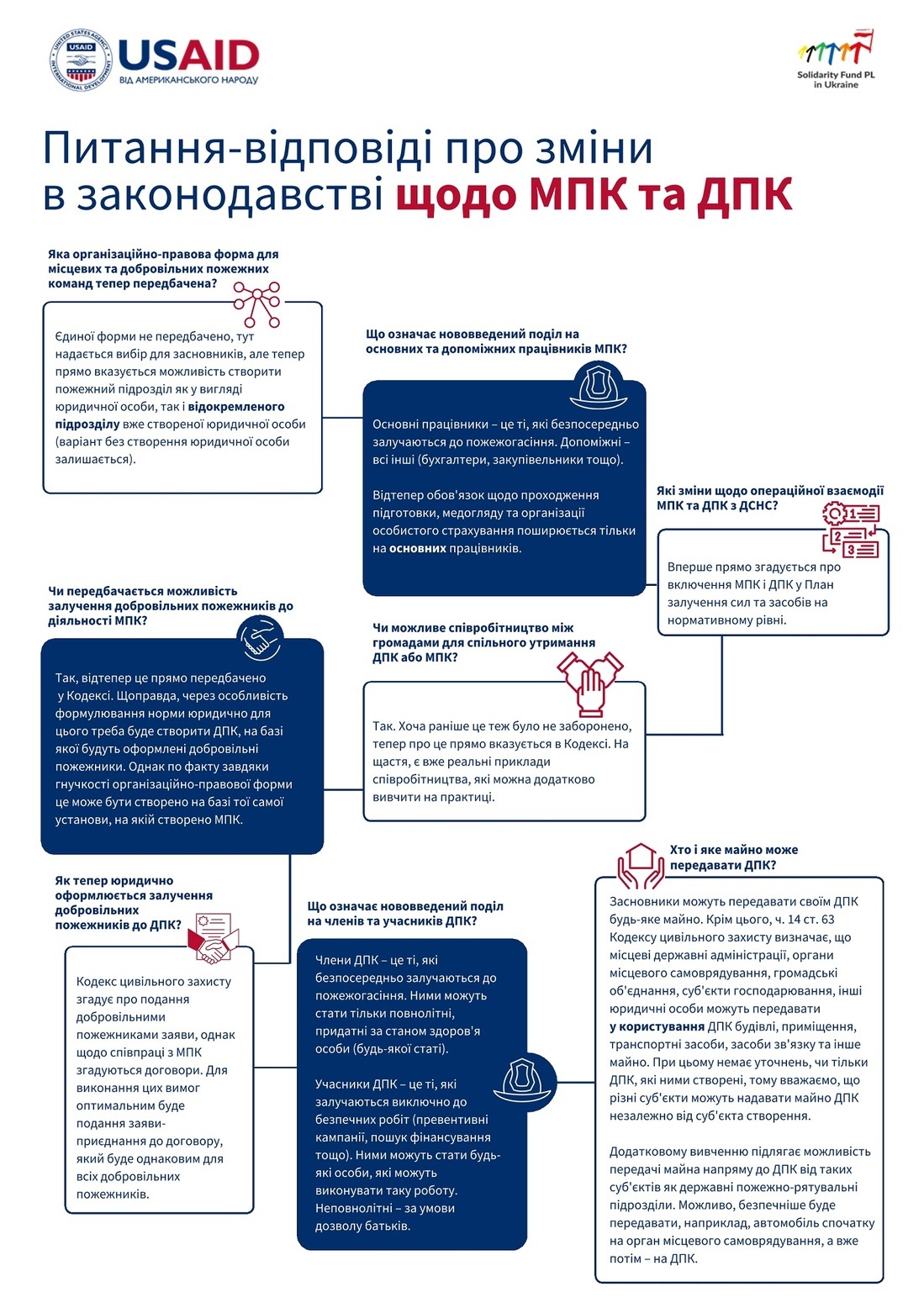 Фонд Міжнародної Солідарності в Україні в рамках проєкту «Цивільний захист з добровільними пожежними командами для громад-партнерок Проєкту USAID «ГОВЕРЛА»» розробив інфографіку, яка надає відповіді на типові питання щодо впроваджених змін.