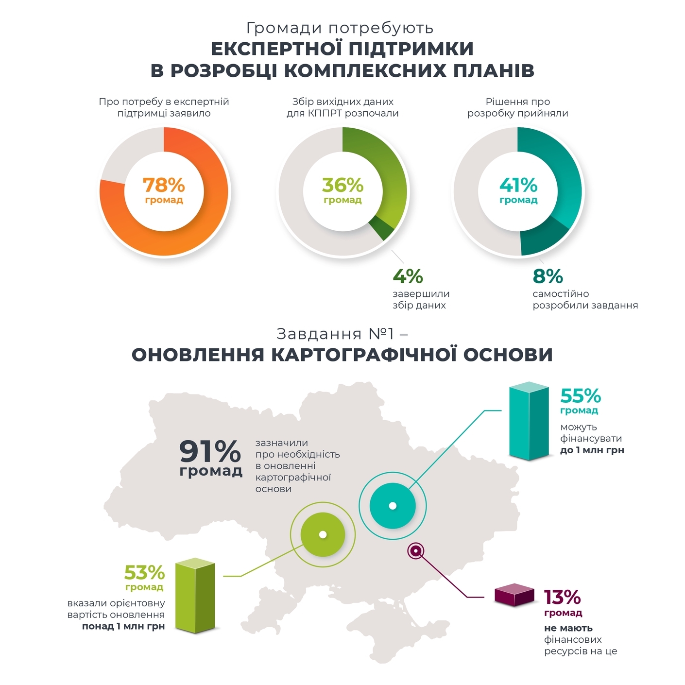 Водночас 78% громад зауважили, що потребують експертної підтримки в розробці комплексних планів. Як доказ – попри те що багато громад прийняли рішення про розробку комплексних планів, лише 8% змогли самостійно розробити технічне завдання на розробку комплексного плану, 36% громад розпочали збір даних для плану, але лише 4% завершили цей процес.