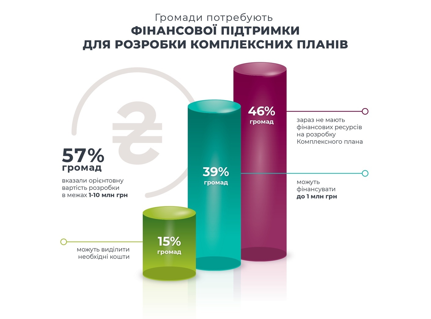 Щодо витрат на розробку комплексних планів, то за оцінками 57% громад на це знадобиться бюджет в розмірі від 1 до 10 млн грн. 15% громад зауважили, що готові виділити необхідну суму. 39% можуть профінансувати до 1 млн грн, а 46% громад відповіли, що на даний час не мають фінансових ресурсів на розробку комплексного плану.