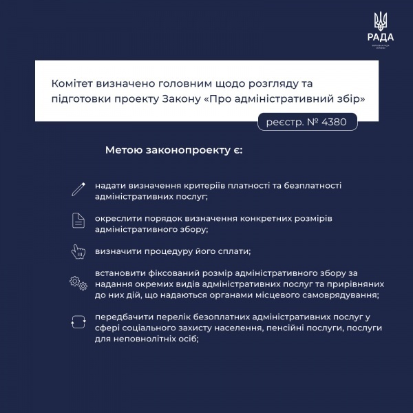Комітет з питань організації державної влади, місцевого самоврядування, регіонального розвитку та містобудування визначили головним щодо розгляду та підготовки проекту Закону №4380 «Про адміністративний збір».