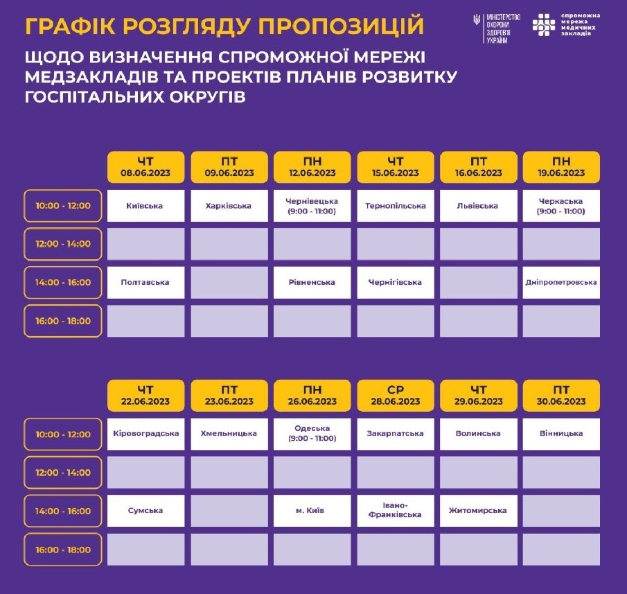 Ці проєкти планів будуть розглянуті МОЗ відповідно до затвердженого графіку за областями: