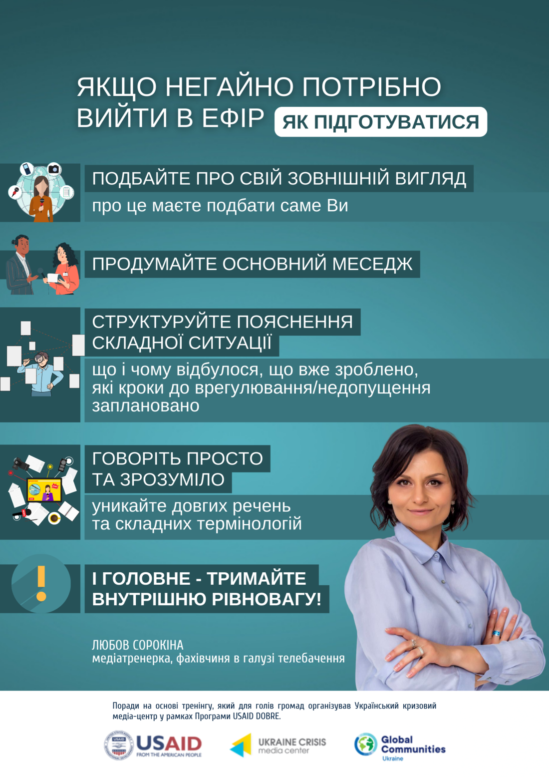 Практичні порадами з тренінгів поділилася Любов Сорокіна, медіатренерка, фахівчиня в галузі телебачення.