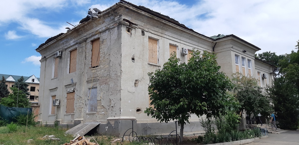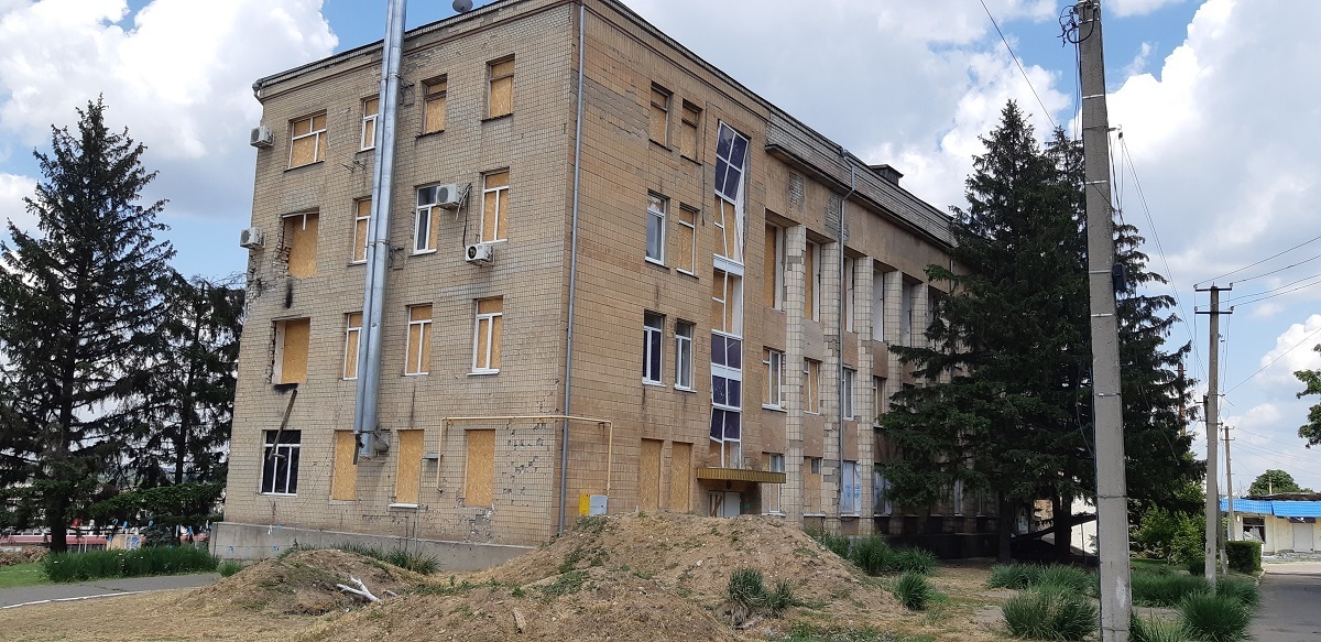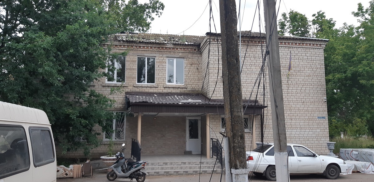Будівля Первомайської селищної ради Миколаївської області (у приміщенні замінено кілька вікон, водночас досі не відремонтована покрівля, відсутнє електропостачання)