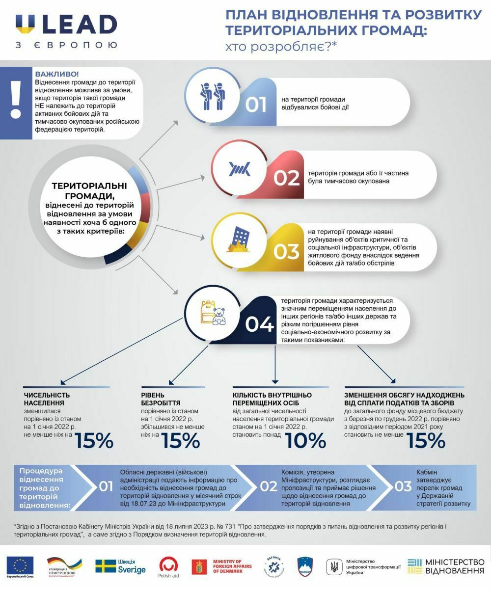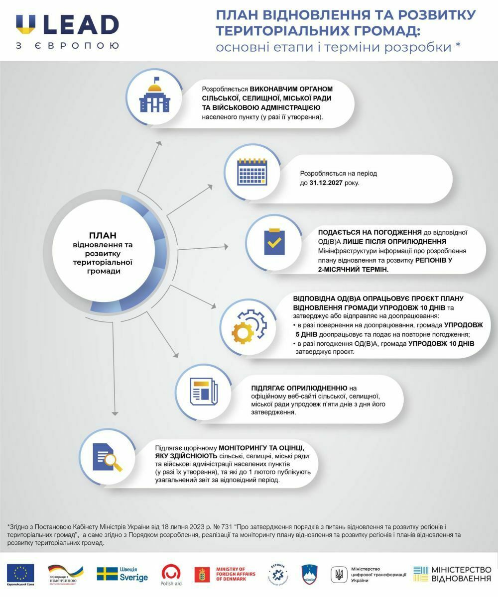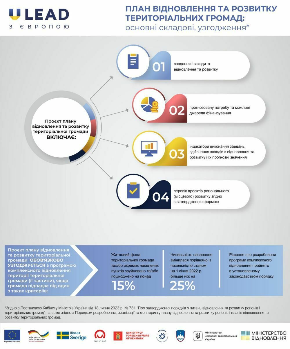 «U-LEAD з Європою» нагадує, що постановою Кабінету Міністрів України від 18 липня 2023 р. №731 вже було затверджено Порядок розроблення, реалізації та моніторингу плану відновлення та розвитку регіонів і планів відновлення та розвитку територіальних громад.
