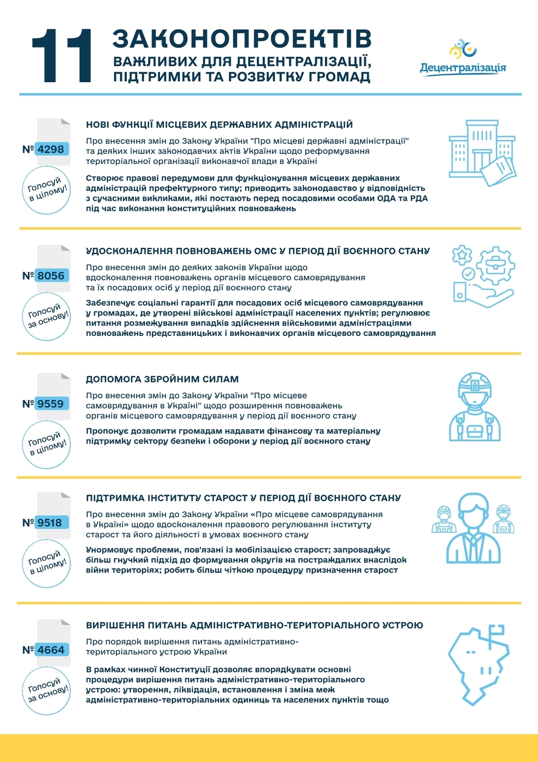 Ми й надалі стежитимемо за розглядом усіх зазначених законопроектів у Парламенті. Щоб не пропустити важливого, слідкуйте за новинами порталу «Децентралізація» у Фейсбуці та Телеграмі.