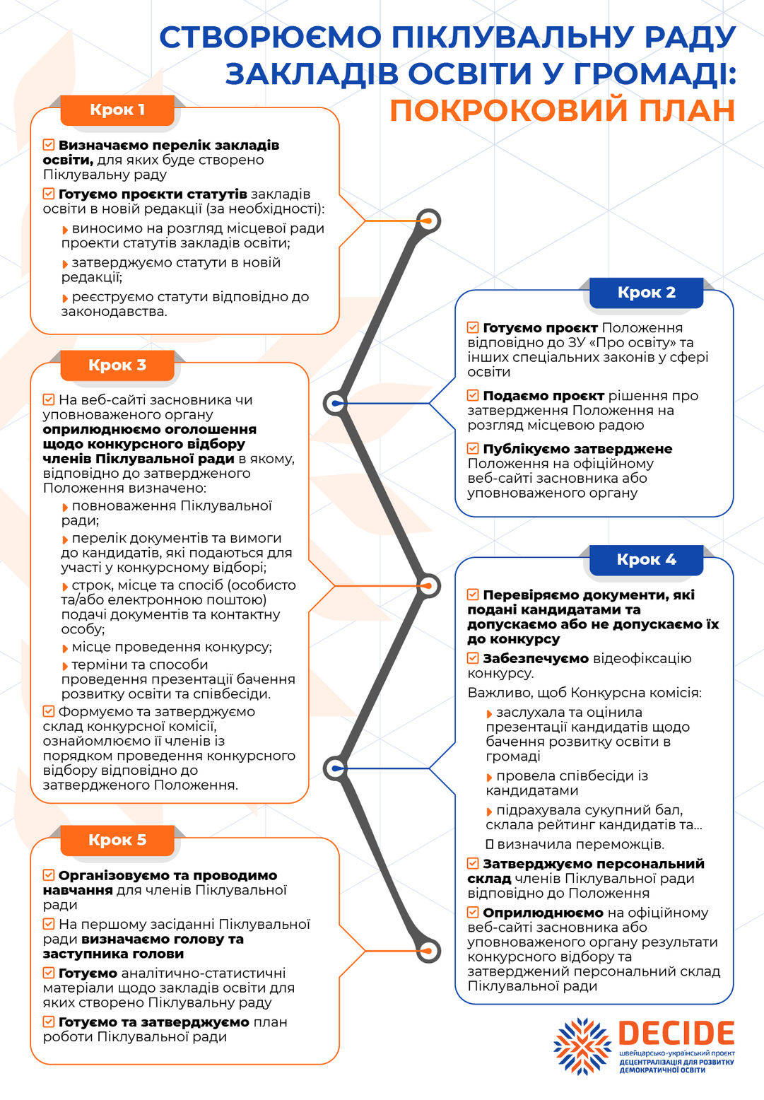 Для того, аби цей процес був більш зрозумілим для засновників закладів освіти та органів управління освітою, пропонуємо покроковий план створення такої Піклувальної ради, який вже можна використовувати, як шаблон для планування своєї роботи.