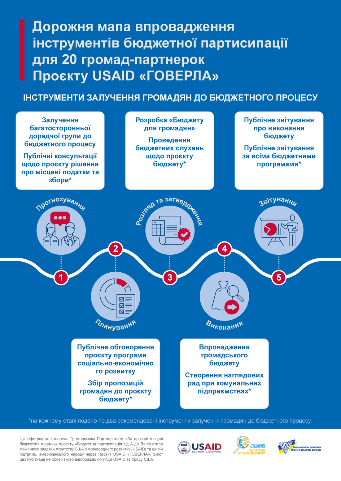 У межах реалізації проєкту “Бюджетна партисипація від А до Я” експерти та експертки Партнерства підготували і передали громадам дорожні мапи системних змін та першочергових кроків щодо впровадження практик відкритості, прозорості та підзвітності до бюджетної політики. У мапах містяться докладні рекомендації щодо покрокового підвищення рівня прозорості бюджетного процесу та залучення громадян на кожному з його етапів і формування, в підсумку, цілісної системи в цій сфері.
