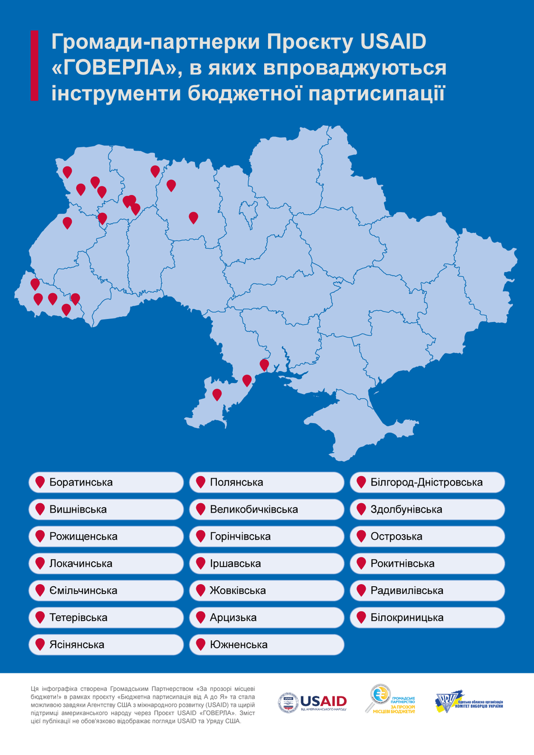 Нагадаємо, учасницями проєкту є Боратинська, Вишнівська, Рожищенська, Локачинська громади з Волині; Ємiльчинська й Тетерівська громади з Житомирщини; Ясінянська, Полянська, Великобичківська, Горінчівська, Іршавська громади із Закарпаття; Жовківська громада з Львівщини; Арцизька, Южненська і Білгород-Дністровська громади з Одещини; Здолбунівська, Острозька, Рокитнівська, Радивилівська та Білокриницька громади з Рівненщини.