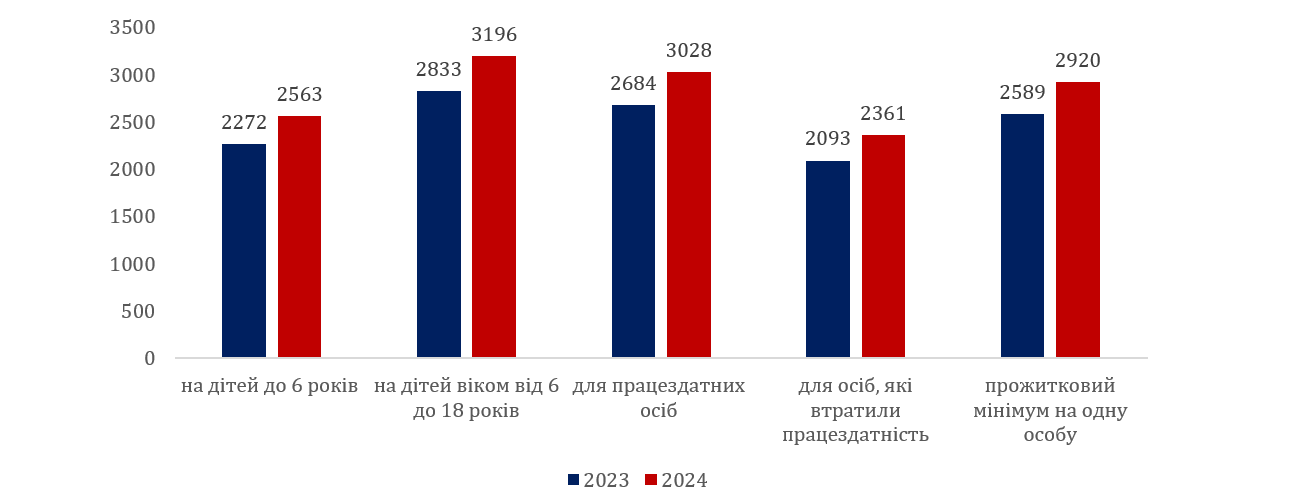 Відповідно до ст. 9 Закону України «Про Державний бюджет України на 2024 рік» від 09.11.2023 № 3460-IX встановлено, що рівень прожиткового мінімуму для призначення допомоги відповідно до Закону України «Про державну соціальну допомогу малозабезпеченим сім’ям» від 01.06.2000 № 1768-III у відсотковому співвідношенні до прожиткового мінімуму для основних соціальних і демографічних груп населення становить для працездатних осіб – 55 %; для осіб, які втратили працездатність, та осіб з інвалідністю – 100 %; для дітей – 140 % відповідного прожиткового мінімуму. Індексацію грошових доходів має бути здійснено в межах фонду оплати праці на 2024 рік. Обчислення індексу споживчих цін для індексації грошових доходів населення має здійснюватися наростаючим підсумком, починаючи з 01.01.2024.