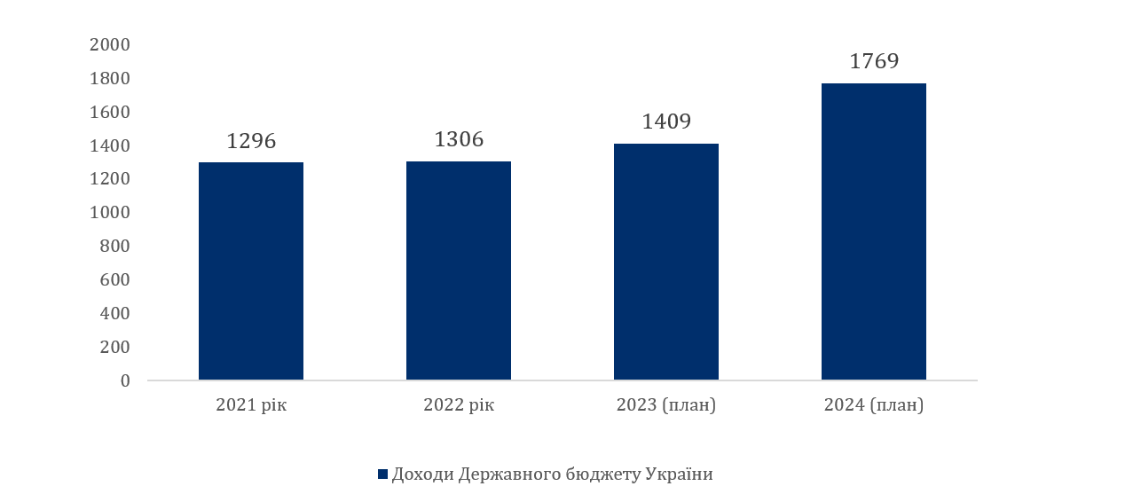 Законом України «Про Державний бюджет України на 2024 рік» від 09.11.2023 № 3460-IX доходи державного бюджету затверджено в сумі 1 768,5 млрд гривень. Основними чинниками формування дохідної частини стали: