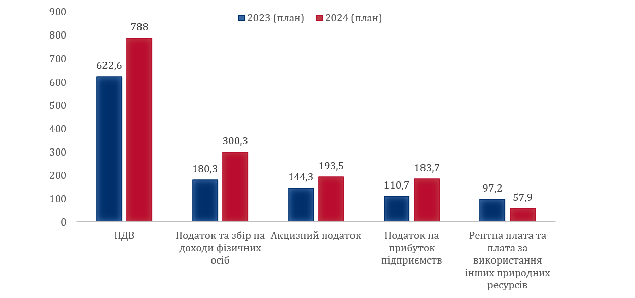 Рис. 3. Динаміка планових показників основних доходів державного бюджету у 2023-2024 роках, млрд грн