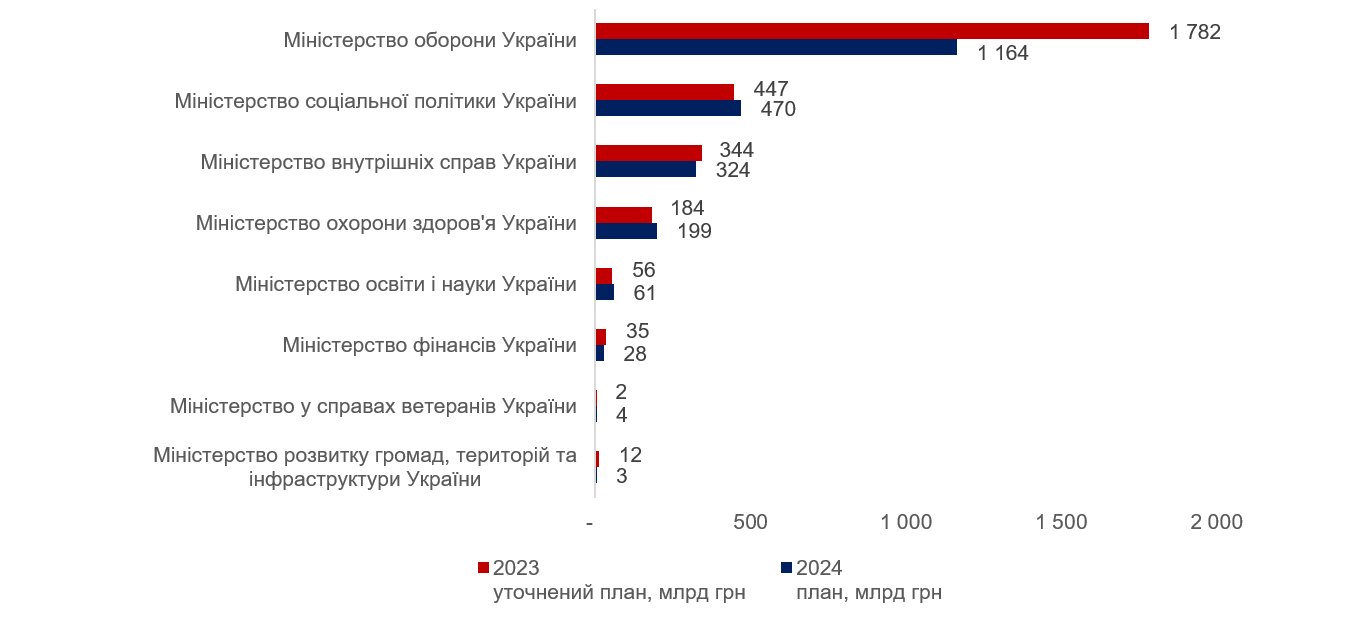 Рис. 5. Основні видатки державного бюджету в розрізі Міністерств у 2023-2024 роках, млрд грн