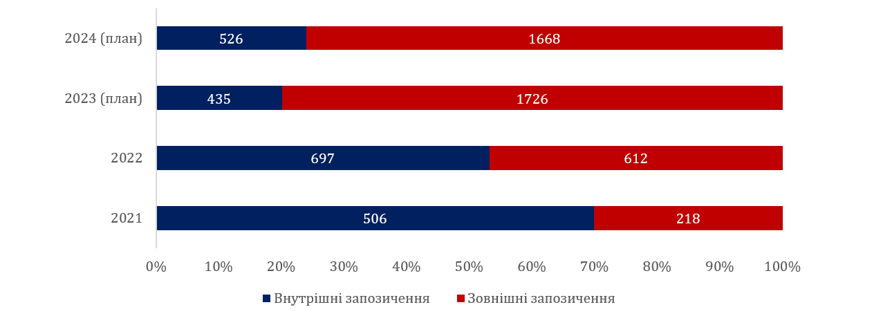 Рис. 7. Структура внутрішніх і зовнішніх запозичень у 2021-2024 роках, млрд грн