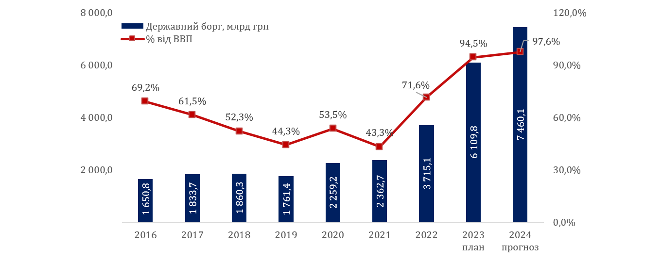 Рис. 8. Обсяг державного боргу та відношення до ВВП у 2016-2024 роках