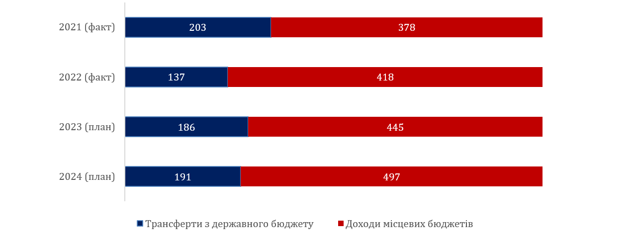 У 2024 році, відповідно до розрахунків Міністерства фінансів України, надходження до місцевих бюджетів складатимуть 675,0 млрд грн, з них доходи місцевих бюджетів – 484,0 млрд грн та трансферти з державного бюджету місцевим бюджетам – 191,0 млрд гривень (рис. 9).