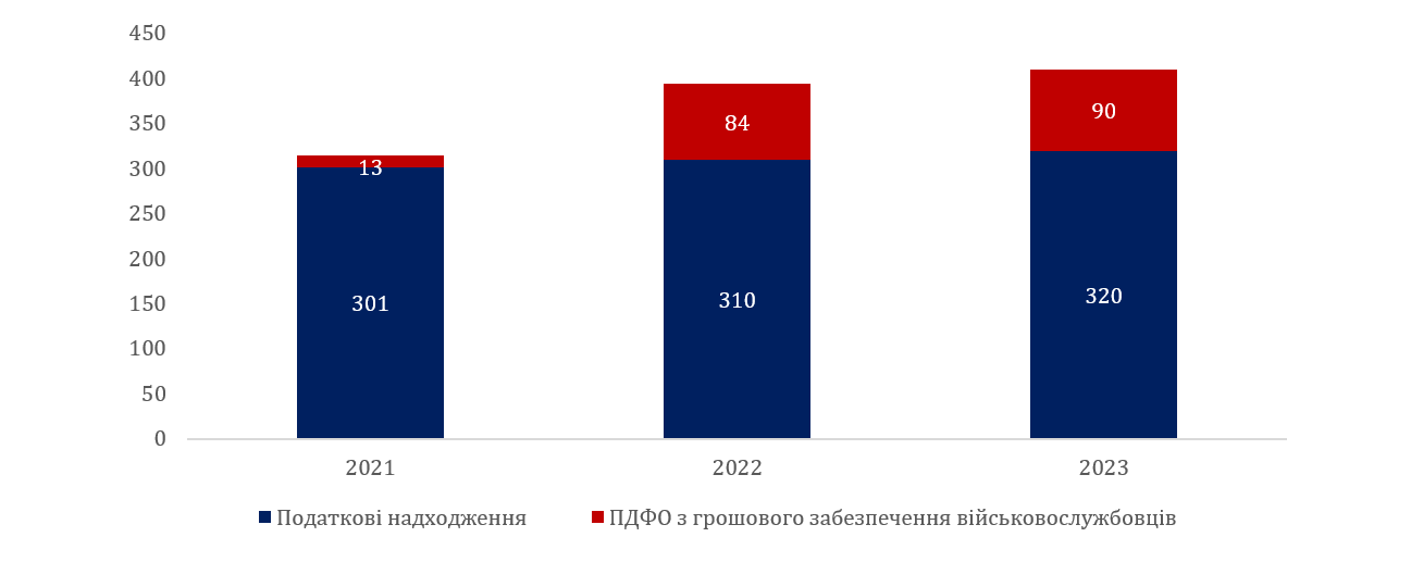 Для забезпечення збільшення податкових надходжень до державного бюджету у 2024 році запроваджено зарахування ПДФО з грошового забезпечення військовослужбовців у повному обсязі до державного бюджету. У 2022 та 2023 роках 64 % цих надходжень зараховувалися до бюджетів територіальних громад та 15 % – до обласних бюджетів. За прогнозними розрахунками Міністерства фінансів України, у 2024 році ці надходження складуть 96,3 млрд грн і стануть додатковим джерелом фінансування видатків сектору оборони та безпеки. Водночас цю суму недоотримають місцеві бюджети.