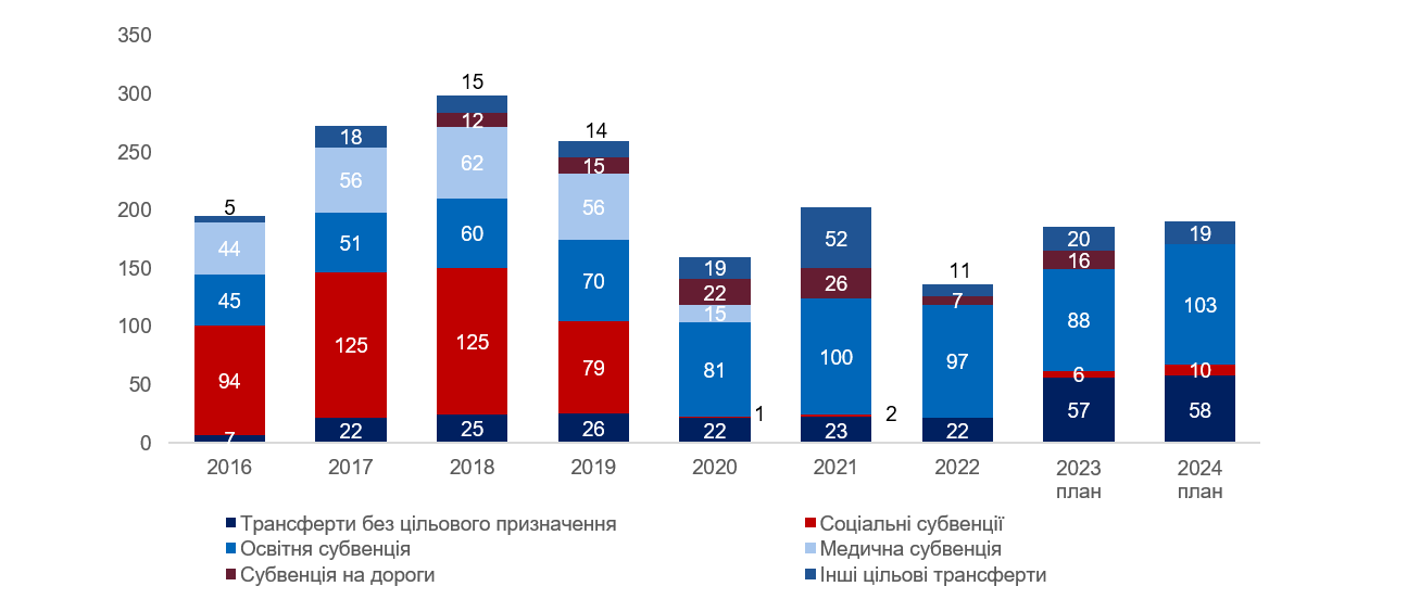 На 2024 рік обсяг трансфертів з державного бюджету передбачений у розмірі 191,0 млрд грн, що на 3,0 % більше від плану у 2023 році та на 6,0 % менше, ніж у 2021 році (рис. 11). Із цієї суми на дотації передбачено 58,0 млрд грн, а на субвенції – 133,0 млрд гривень.