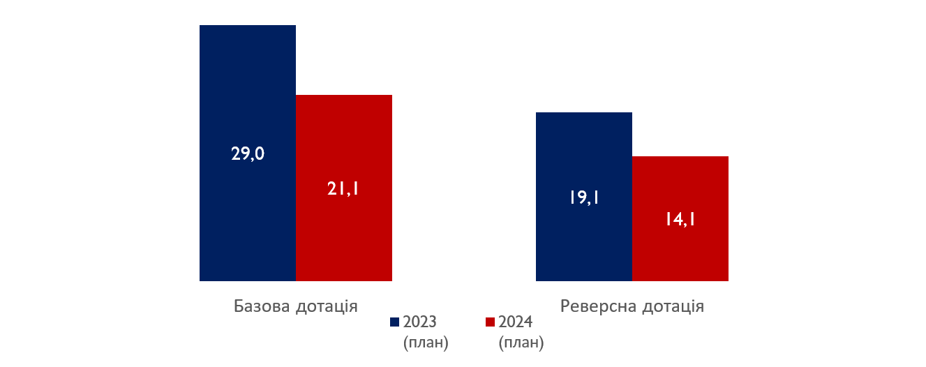 За розрахунками Міністерства фінансів України, у 2024 році обсяг базової дотації становитиме 21,1 млрд грн, а обсяг реверсної дотації – 14,1 млрд гривень (рис. 13). У порівнянні з 2023 роком, обсяг базової дотації зменшився на 27 %, а реверсної – на 26,2 %, що зумовлено, зокрема, зменшенням дисбалансів через перерозподіл ПДФО з грошового забезпечення військовослужбовців до державного бюджету.