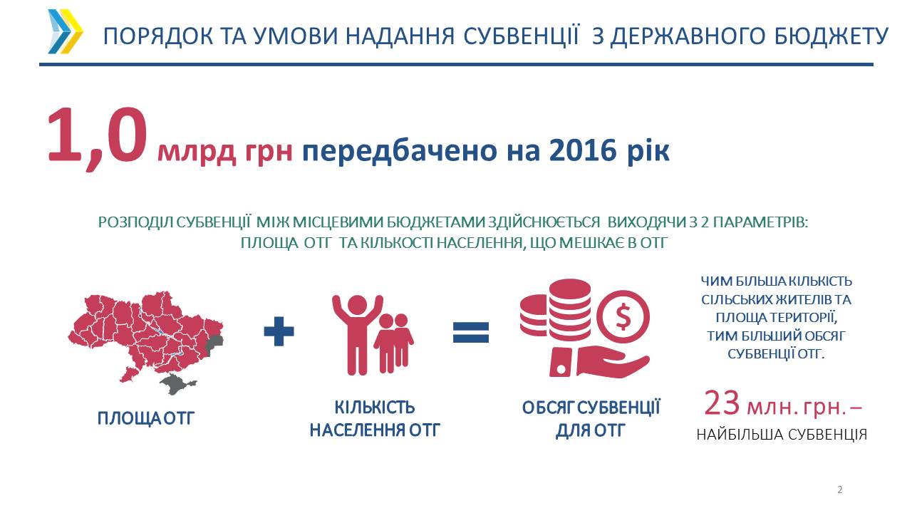 Кошти субвенції розподілятимуться між об’єднаними територіальними громадами за чіткою формулою: в залежності від кількості сільського населення і площі об’єднаної територіальної громади.