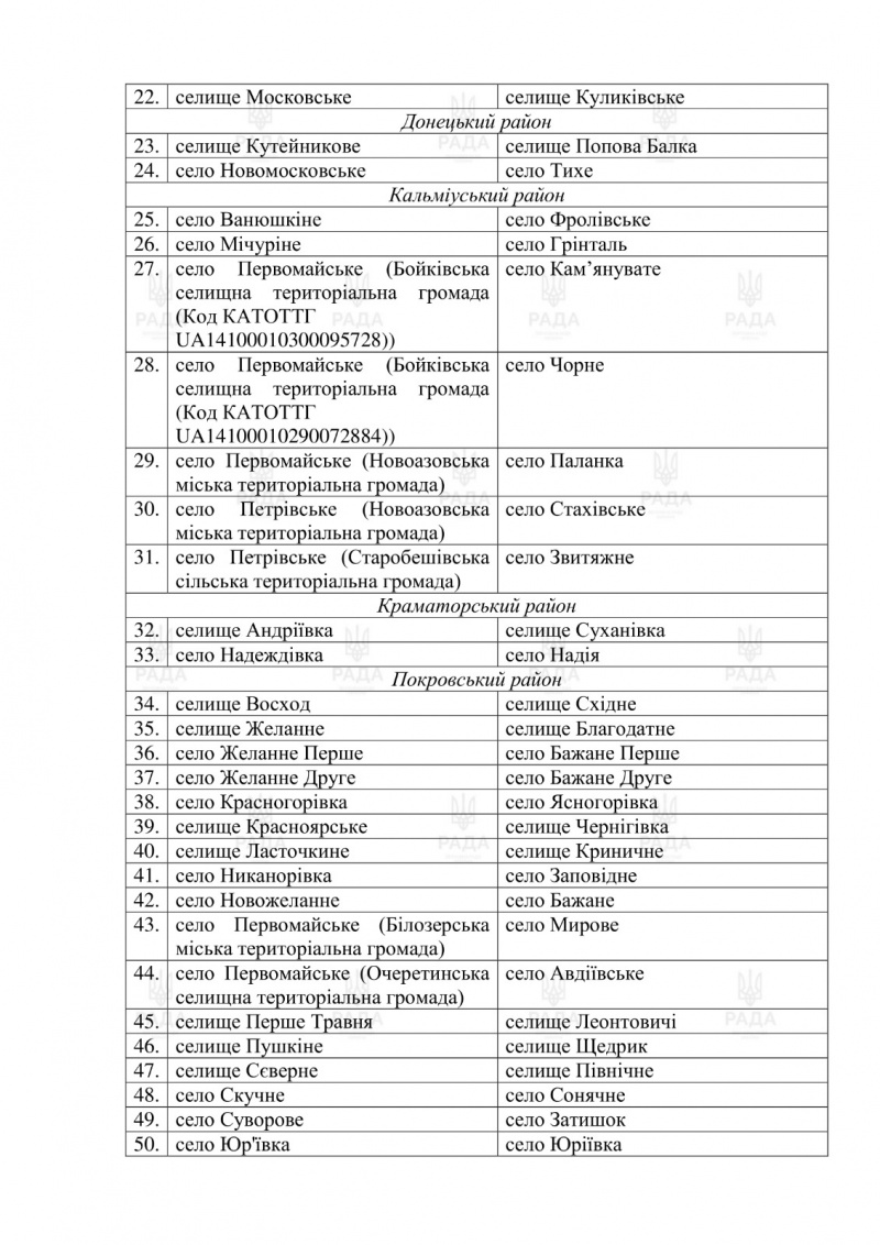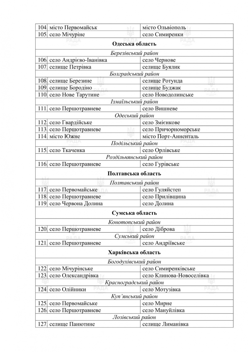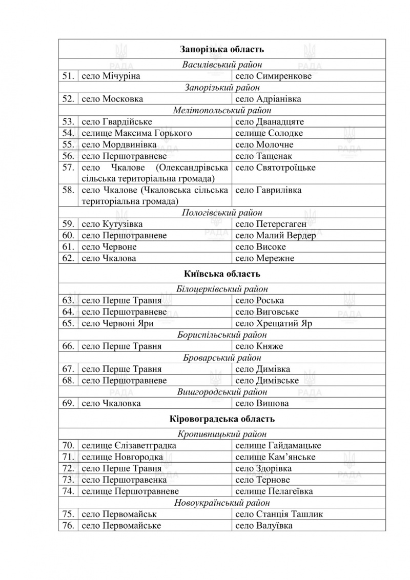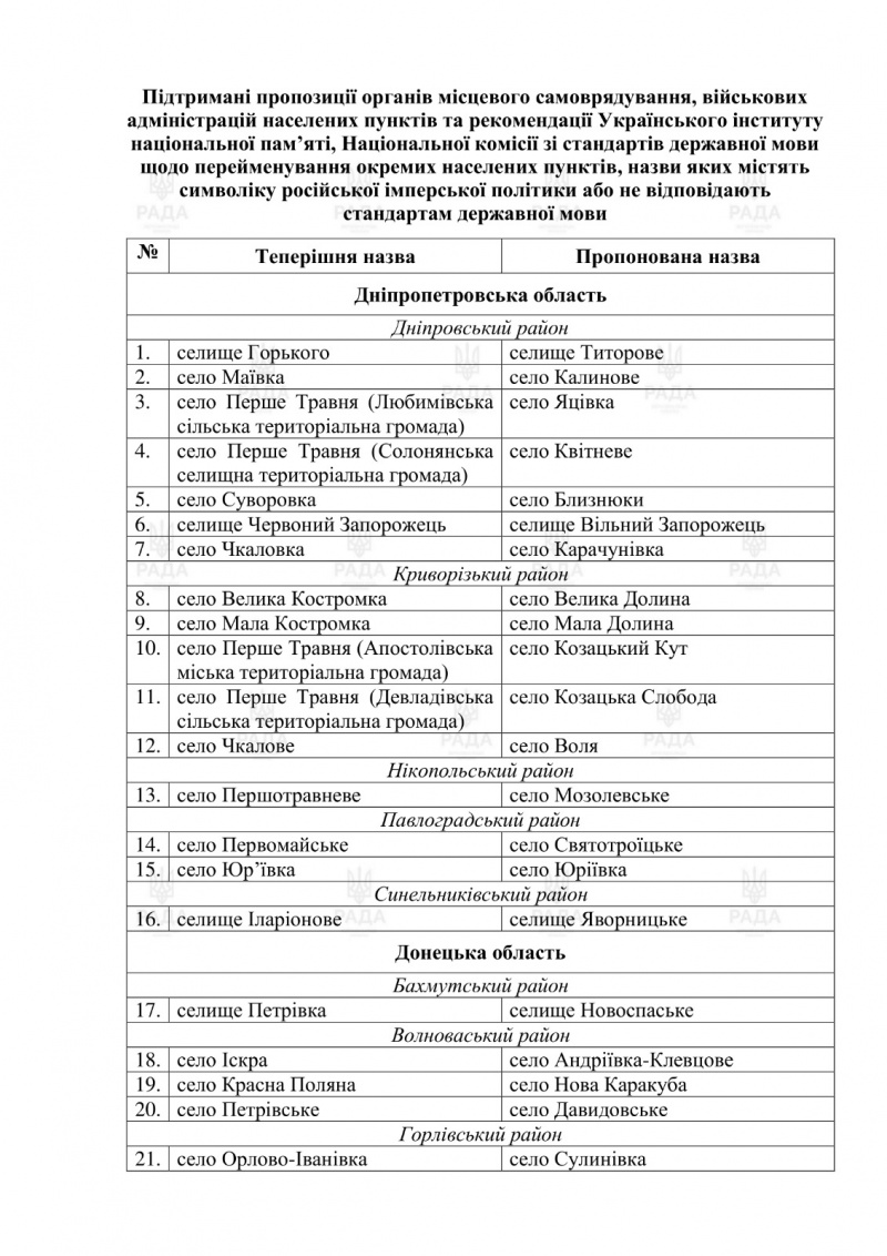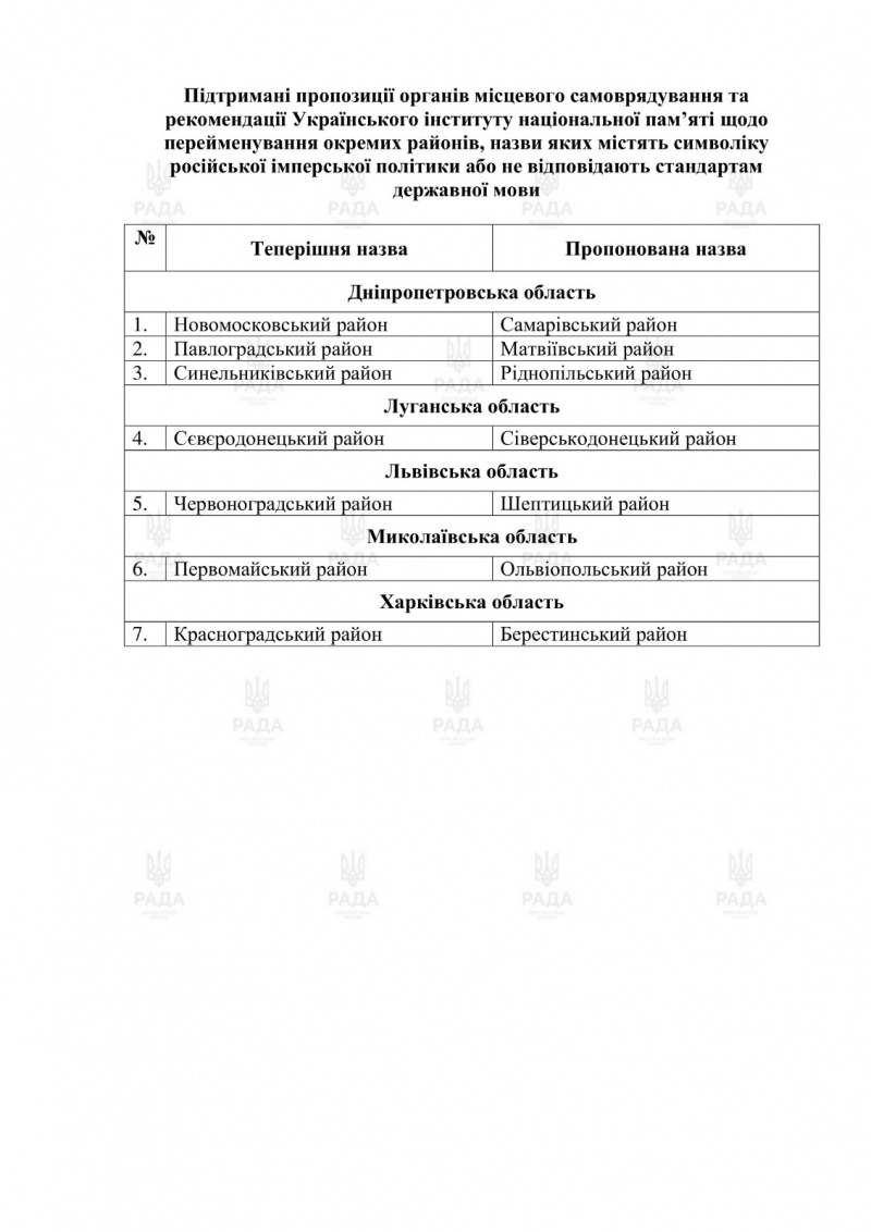 10 квітня 2024 року парламентський Комітет з питань організації державної влади, місцевого самоврядування, регіонального розвитку та містобудування ухвалив рішення про перейменування двох міст, семи районів та 149 сіл і селищ. Остаточне рішення ухвалюватиме Верховна Рада України.