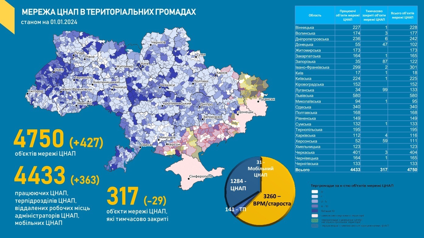 В територіальних громадах України працює 4433 Центри надання адміністративних послуг, їхні терпідрозділи, віддалені робочі місця адміністраторів ЦНАП та мобільні ЦНАП. Тимчасово не працюють – 317.