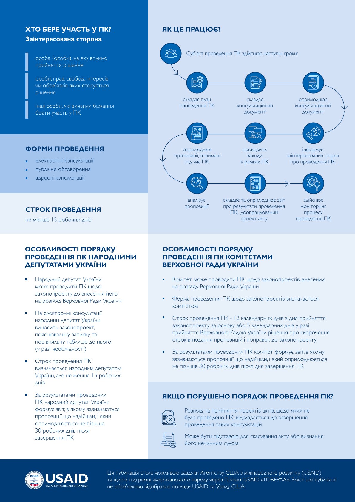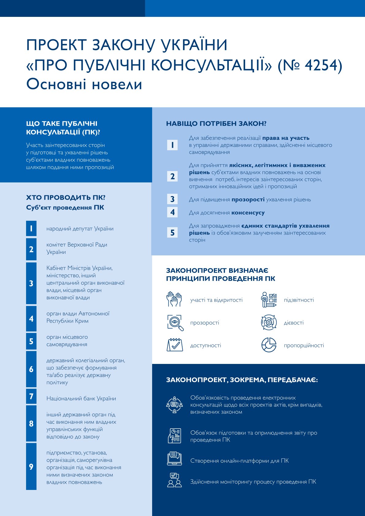 20 червня Верховна Рада України ухвалила Закон України «Про публічні консультації». Закон забезпечує участь заінтересованих сторін (стейкхолдерів) у підготовці та ухваленні рішень суб’єктами владних повноважень, зокрема, органів місцевого самоврядування через подання ними пропозицій. Експерти Проєкту USAID «ГОВЕРЛА» пояснюють основні зміни.