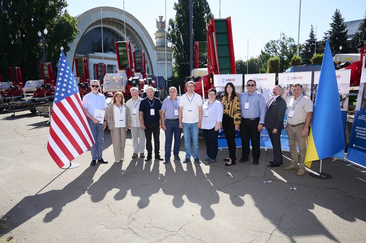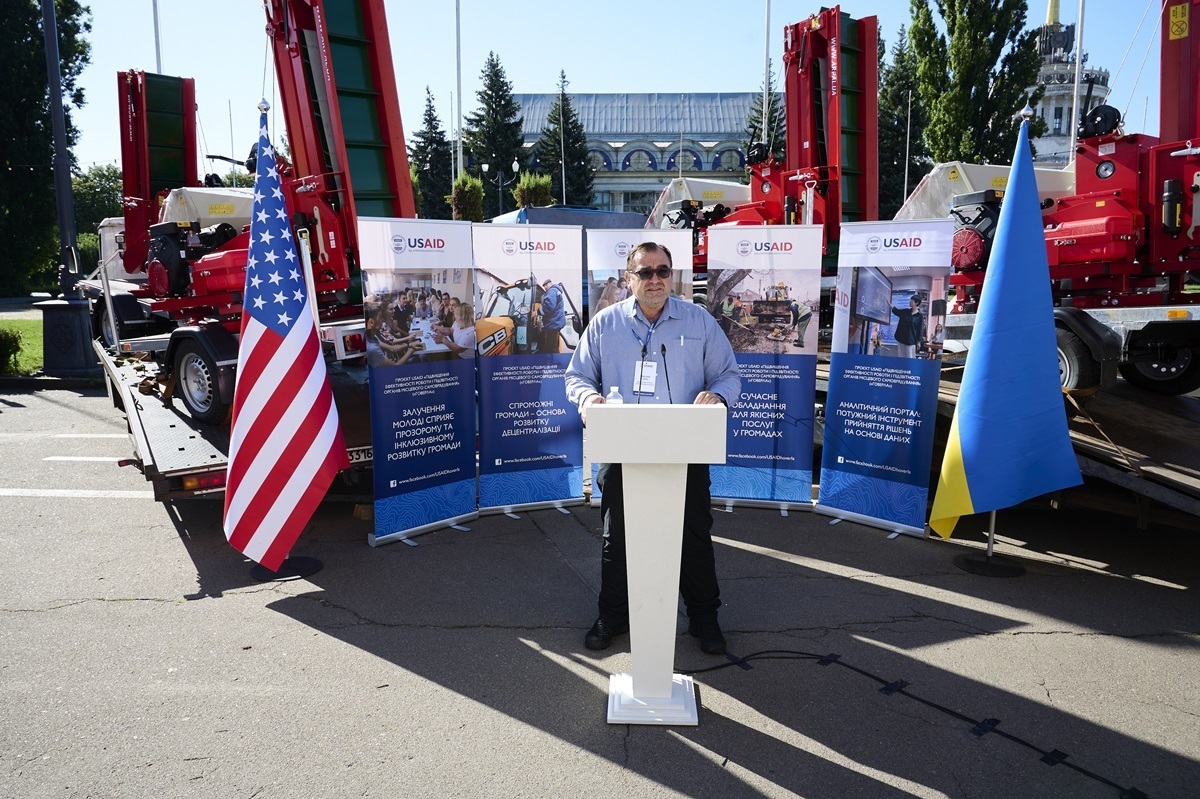 Director of USAID Democracy and Governance Office Ann Hopper handed over woodchippers to communities across Ukraine to help prepare wood to be used as fuel forheating during the winter months. Mayors from five communities in Chernihiv and Poltava received the equipment.