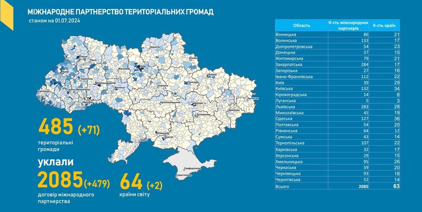 Територіальні громади України активно розвивають мережу міжнародного партнерства. 479 угод про побратимство з муніципалітетами країн світу громади уклали тільки за ІІ квартал 2024 року. Всього таких партнерств – 2089. Про це свідчать дані Моніторингу реформи місцевого самоврядування та територіальної організації влади, який Мінінфраструктури підготувало станом на 10 липня 2024 року (ЗАВАНТАЖИТИ моніторинг, PDF 4,7 Мб).
