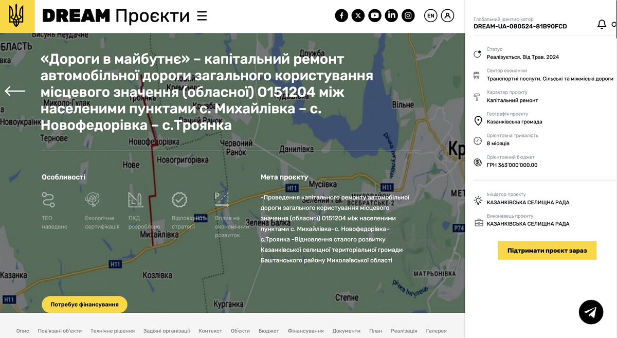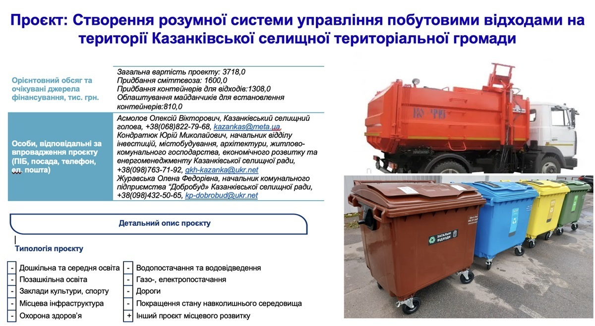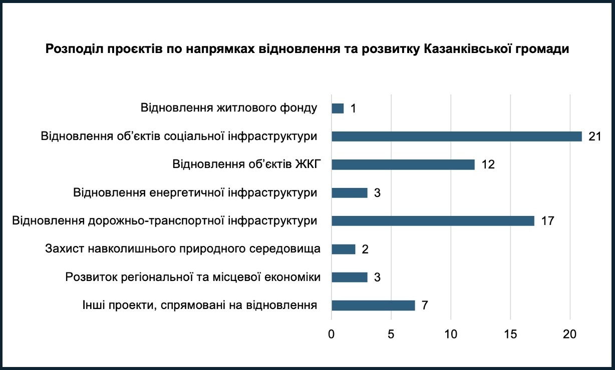 Результатом цієї спільної роботи стала розробка 66 проєктів, які увійшли до Плану заходів з реалізації Програми комплексного відновлення території Казанківської громади. Ці проєкти охопили всі ключові сфери життя громади, забезпечуючи:  відновлення житлового фонду, об’єктів соціальної інфраструктури, ЖКГ, і дорожньо-транспортної інфраструктури; захист навколишнього природного середовища; розвиток енергетичної інфраструктури та місцевої економіки. Серед них проєкти: «Створення у Новоданилівці на базі непрацюючого дитячого садка пансіонату для відпочинку дітей ВПО і школярів малозабезпечених сімей», «Дорога в майбутнє» – капітальний ремонт автомобільної дороги загального користування місцевого значення (обласної) О151204 між населеними пунктами с. Михайлівка – с. Новофедорівка – с.Троянка», «Будівництво у селищі Казанка насосної станції з резервуаром чистої води на 1000 кубометрів», «Створення розумної системи управління побутовими відходами на території Казанківської селищної територіальної громади», «Створення хабу креативної економіки у реконструйованих підвальних приміщеннях  клубів Михайлівського, Троїцько-Сафонівського та Веселої  Балки», «Будівництво на базі Сафонівського родовища уранових руд комплексу з видобутку урану за технологією свердловинного підземного вилуговування», «Будівництво компанією «Козак Енерджі» вітряної електричної станції», «Створення Агентства соціально-економічного розвитку Казанківської громади «Енергія розвитку».