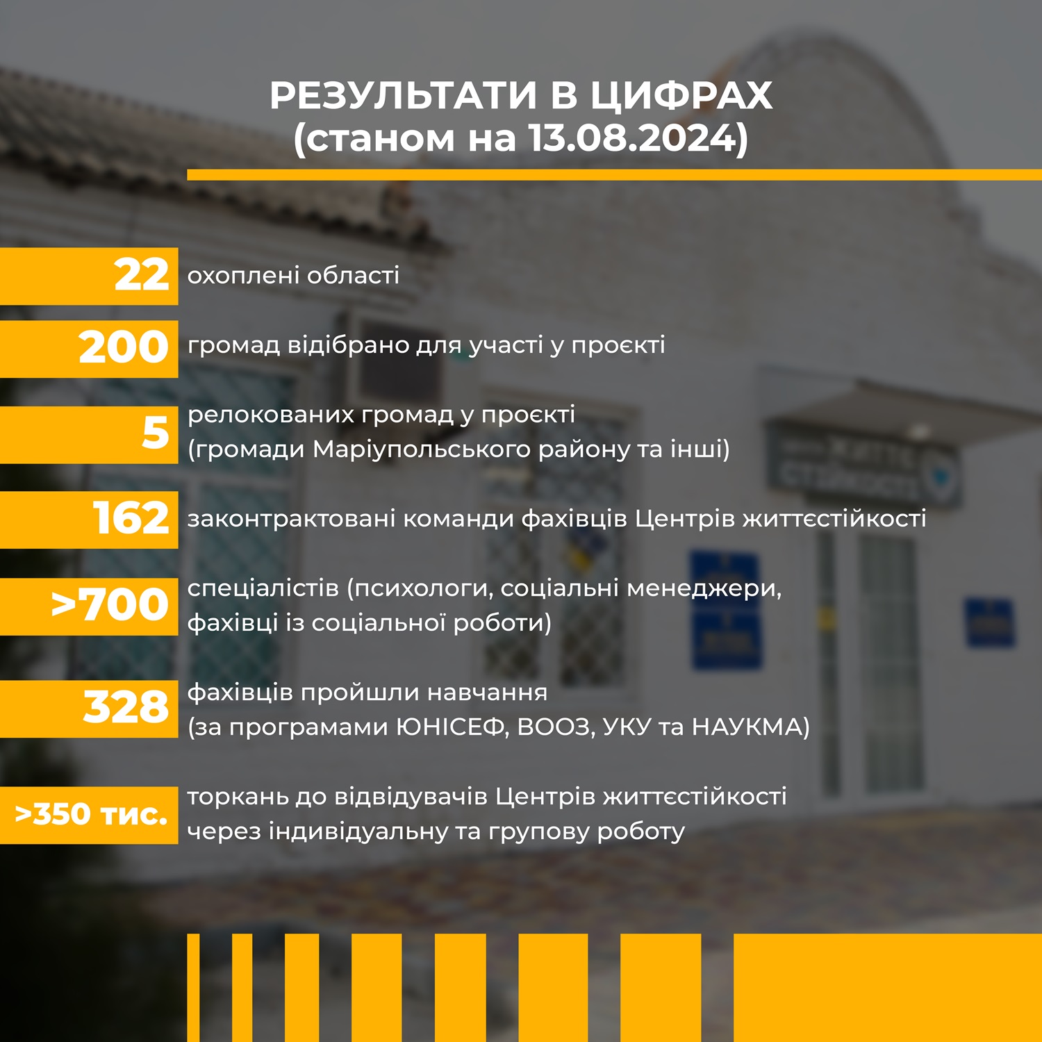 У лютому Мінсоцполітики профінансувало 14 команд Центрів життєстійкості, а до серпня їхня кількість зросла до 162. Сьогодні в рамках проєкту виплачено майже 48 мільйонів гривень, а для повного фінансування програми в бюджеті закладено близько 430 мільйонів гривень.