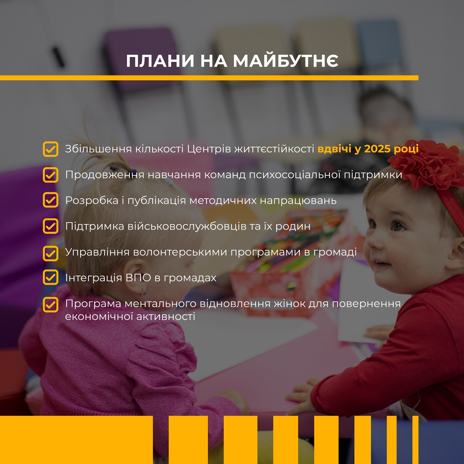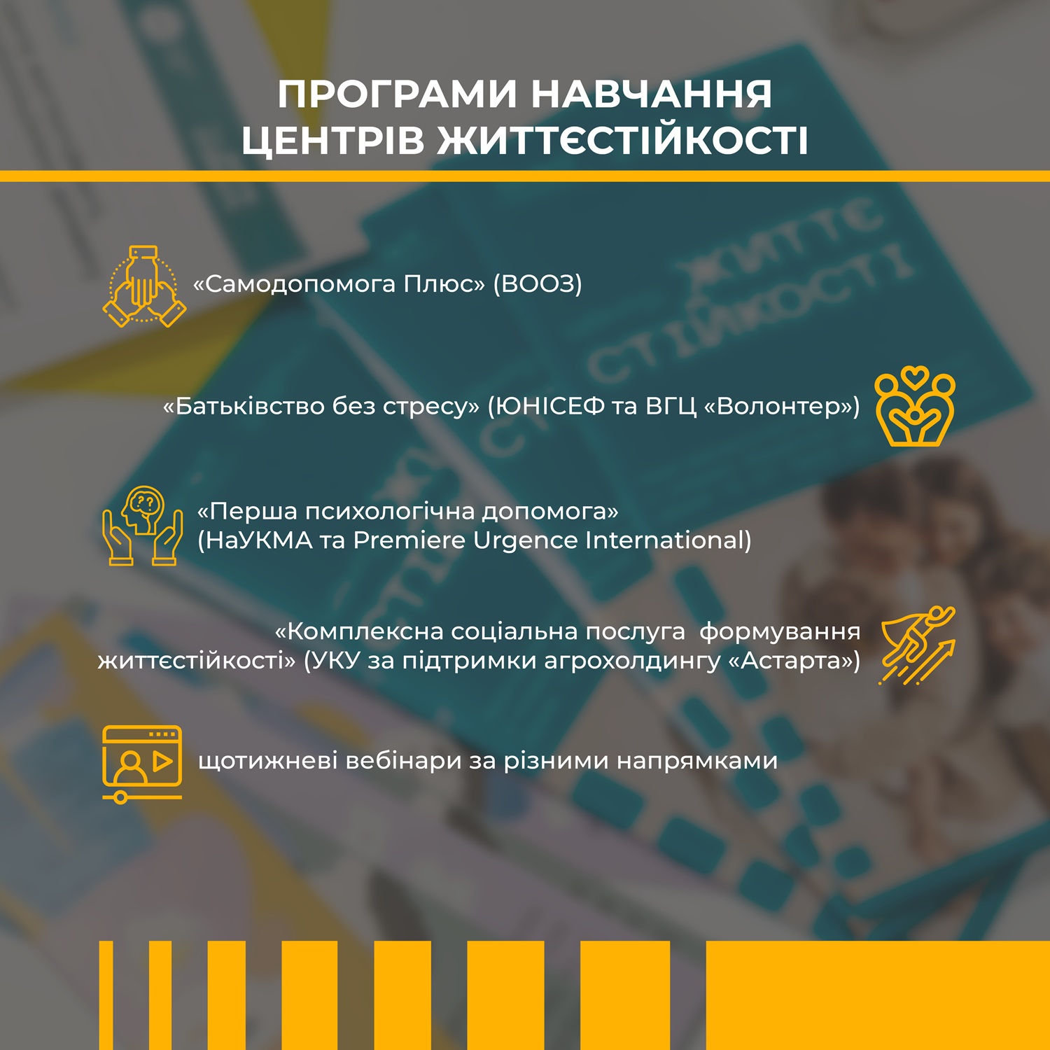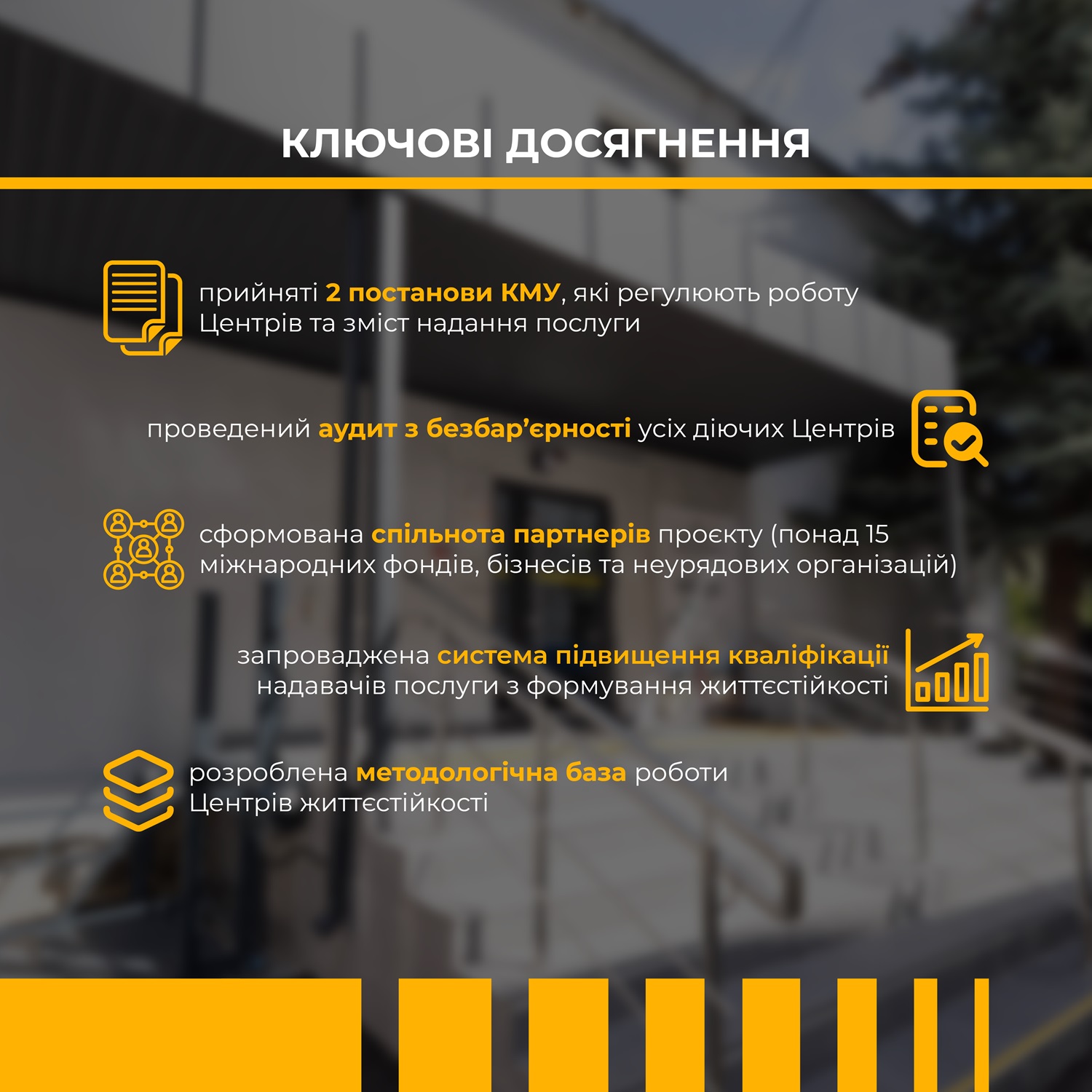 Кожен такий Центр облаштований за принципами безбар’єрності і туди може звернутися будь-хто з жителів громади. У таких осередках надають комплексну послугу з формування життєстійкості. Вона включає: