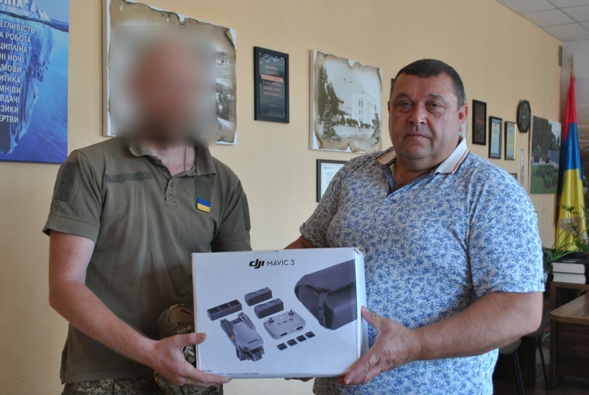 Олег Кошовий передає військовим один із 60-ти придбаних Шполянською міською радою для фронту квадрокоптерів