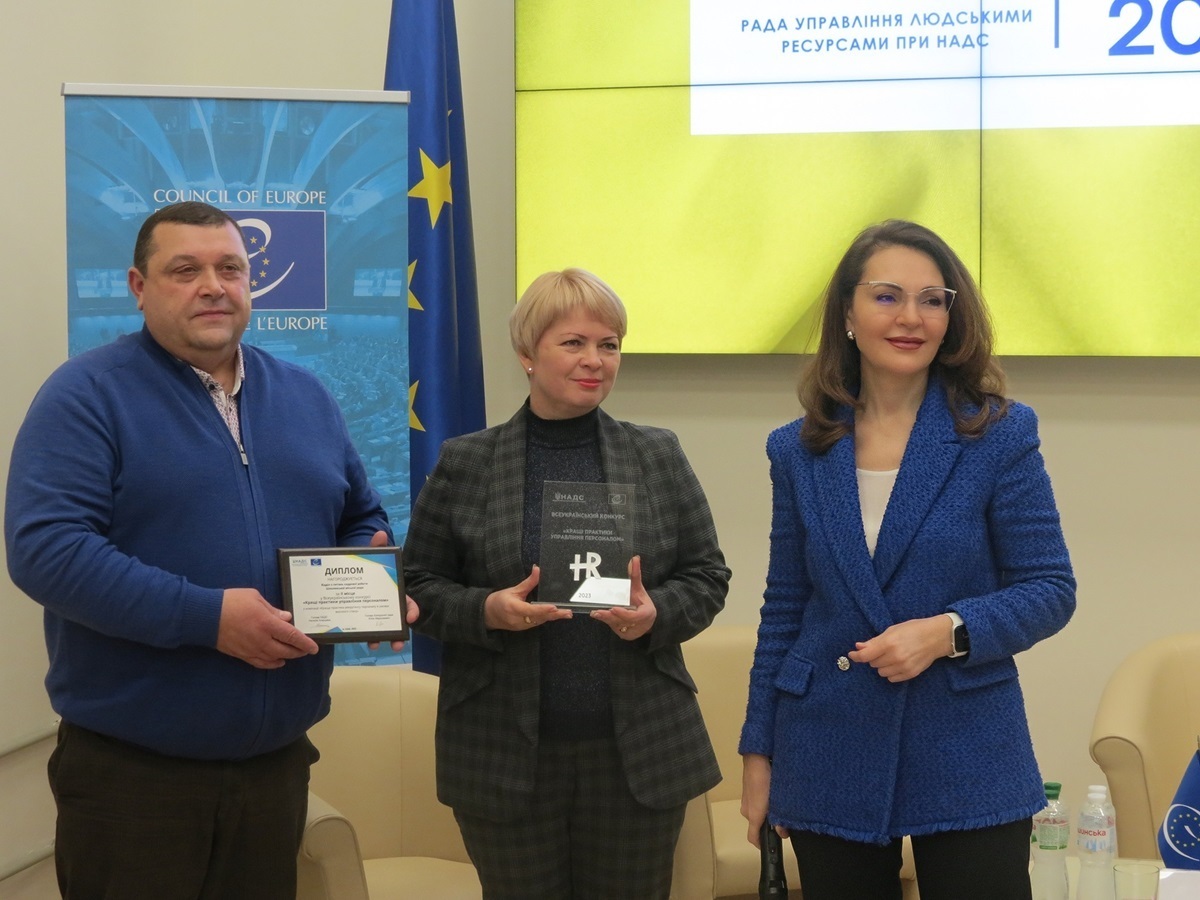 Виконуючий обов'язки Шполянського міського голови Олег Кошовий, його заступниця Ірина Каландирець (у центрі) та голова Національного агентства України з питань державної служби Наталія Алюшина під час нагородження за ІІ місце на Всеукраїнському конкурсі «Кращі практики управління персоналом». Київ, грудень 2023 року