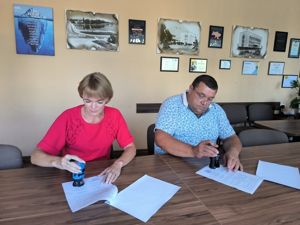 Олег Кошовий (праворуч) підписує меморандум про співпрацю з головою ГО «Об’єднані духом» Наталією Поліщук, яке вчитиме мешканців Шполянської громади правильно дбати про своє здоров’я