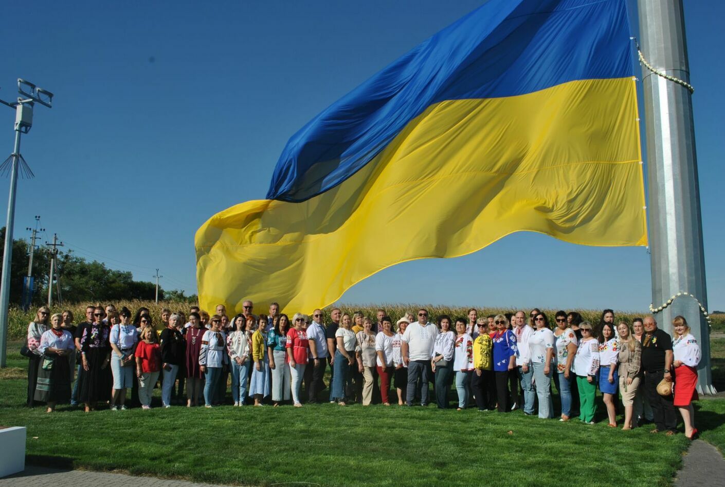 Колектив Шполянської міської ради коло арт-об’єкта «Серце України» у День прапора 23 серпня цього року. За мить величезний прапор урочисто піднімуть на 52-метрову щоглу