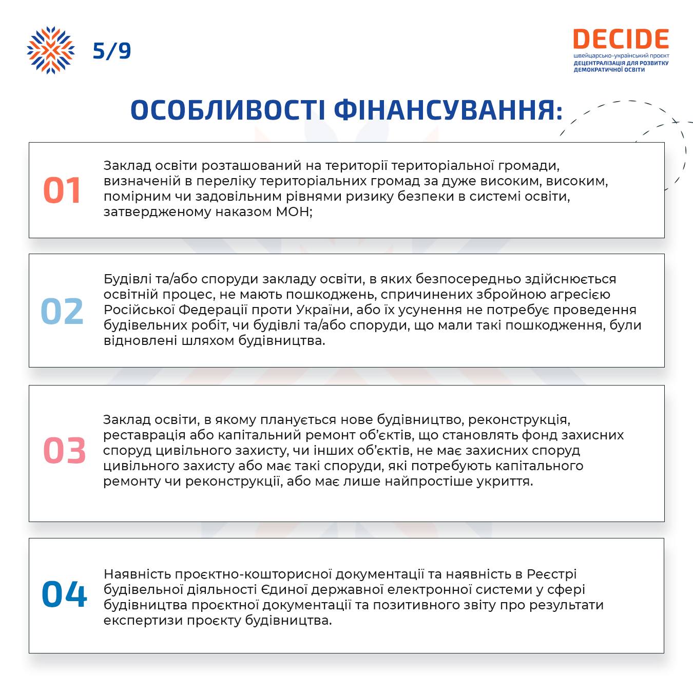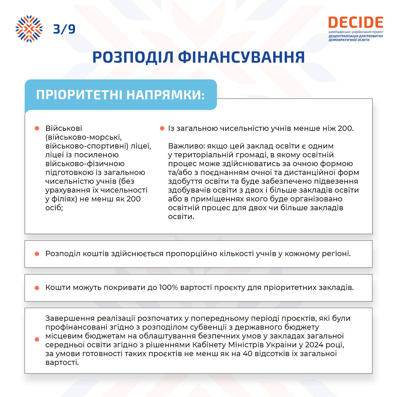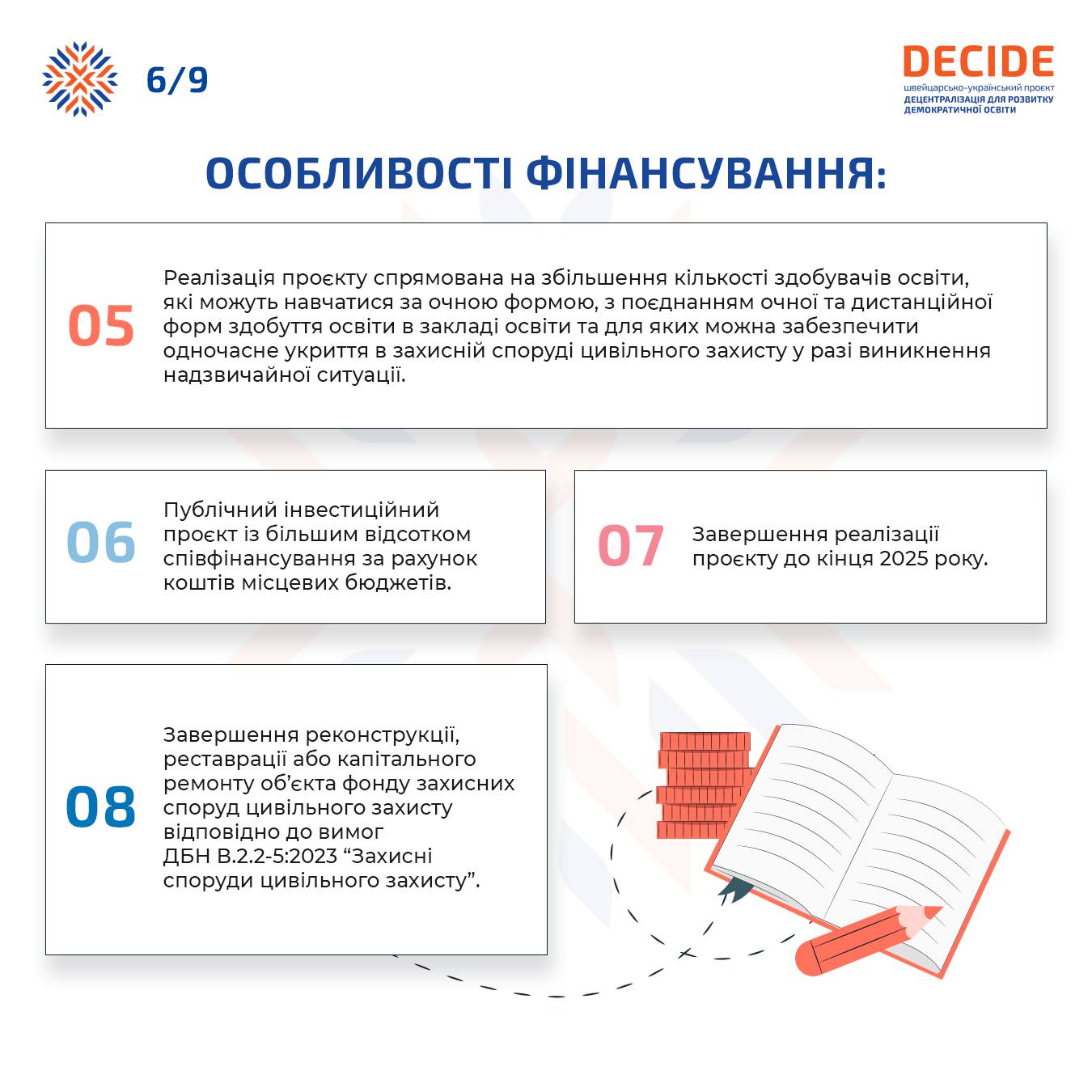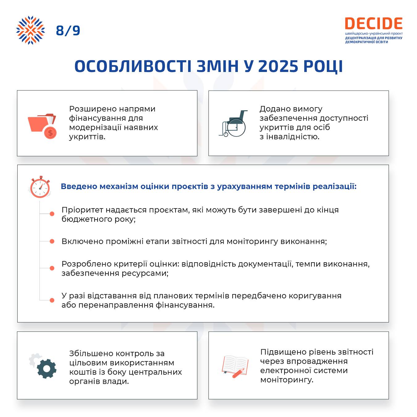 Пріоритет надається військовим ліцеям із чисельністю учнів понад 200 осіб, а також закладам, що є єдиними у своїй громаді, де навчання може здійснюватися очно або у змішаній формі. Також фінансуватимуть завершення проєктів із 2024 року. Підтримка може покрити до 100% витрат на облаштування укриттів, залежно від рівня податкоспроможності громади.