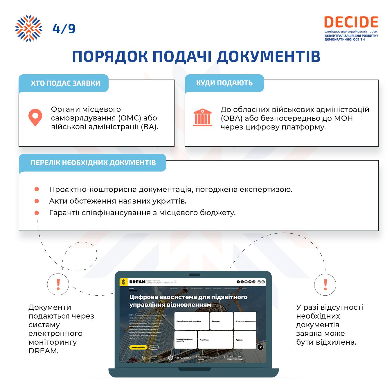 У 2025 році заявки подають через платформу DREAM, а контроль здійснюватиметься за допомогою електронної системи моніторингу. Для подачі заявки органи місцевого самоврядування та військові адміністрації мають надати погоджену проєктно-кошторисну документацію з експертизою, акти обстеження укриттів і гарантії співфінансування.