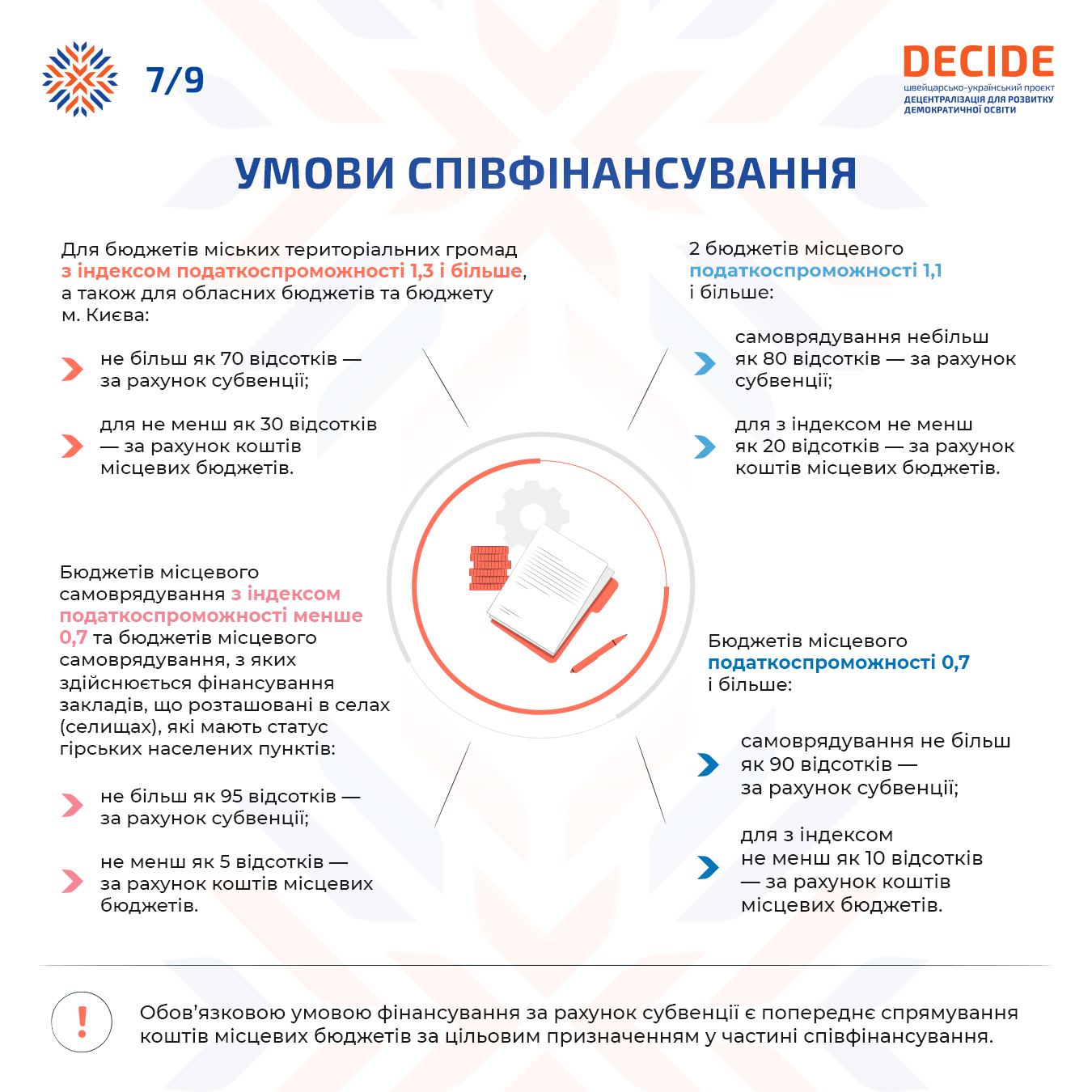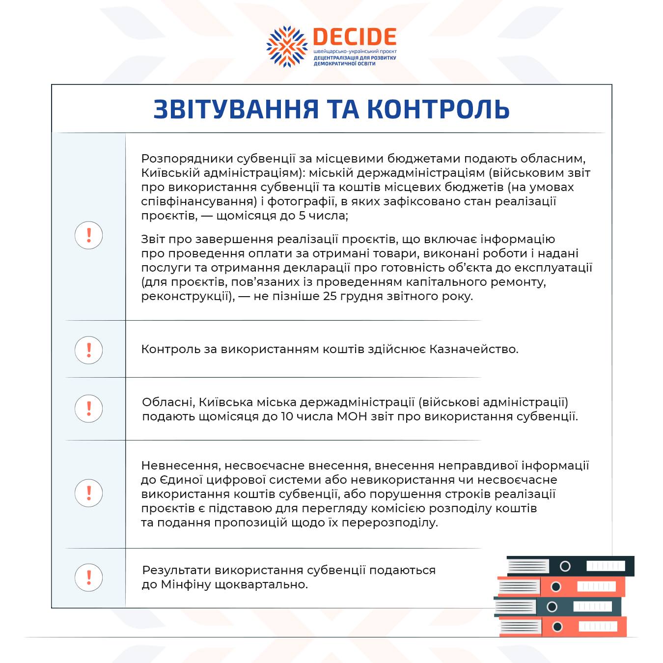 Детальніше про особливості фінансування, порядок подачі документів, звітування та контроль за використанням коштів дивіться в інфографіці, яку підготували експерти Швейцарсько-українського проєкту DECIDE.