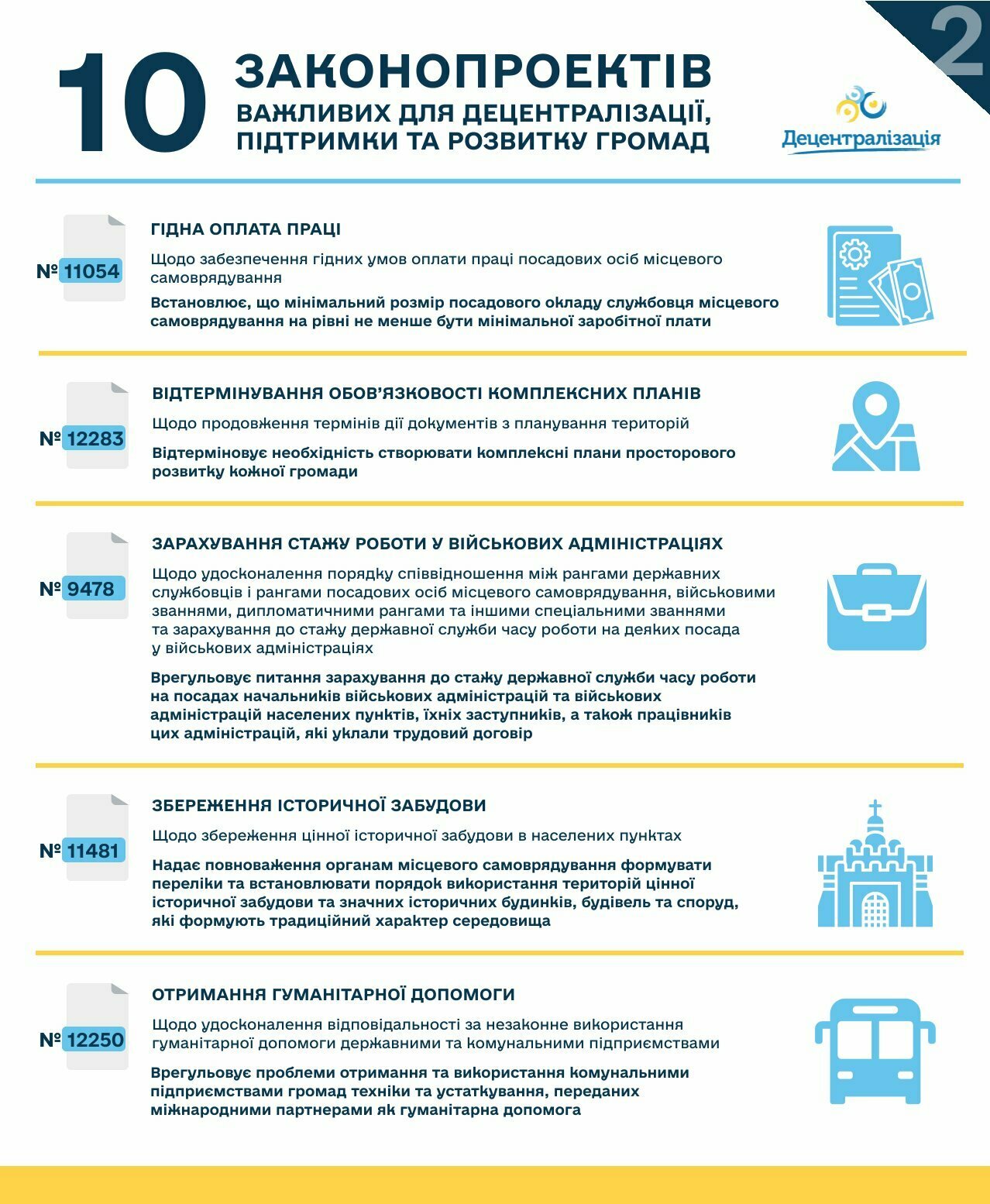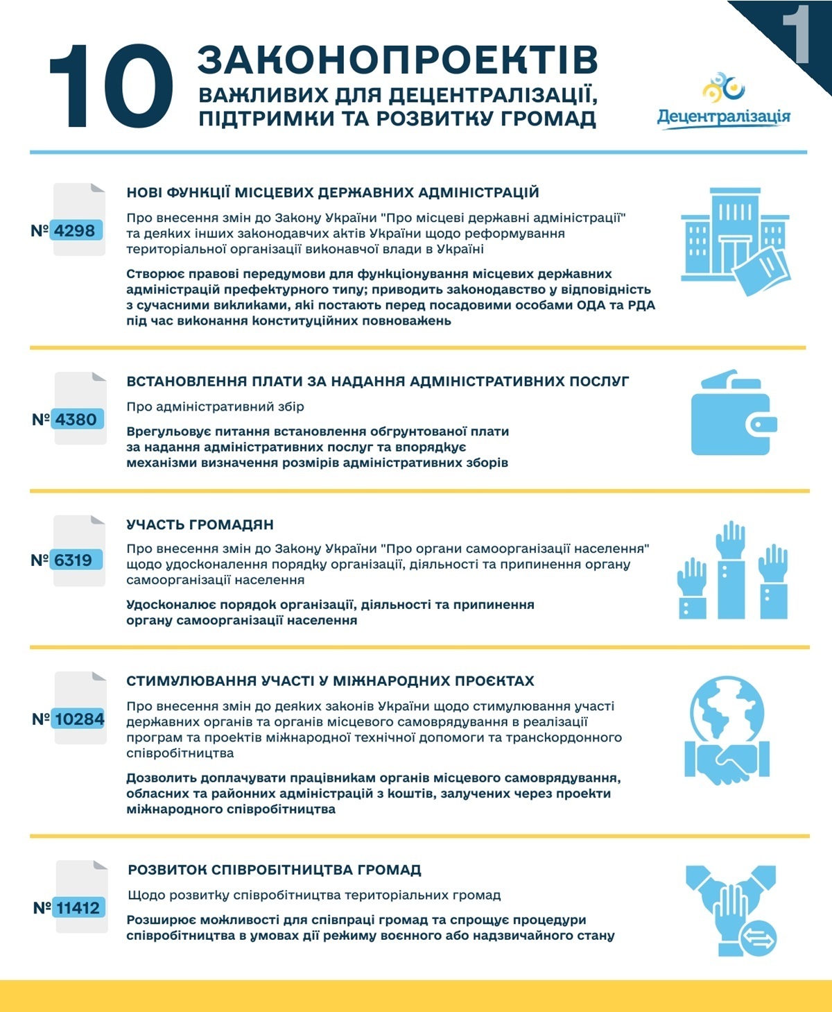 Усі актуальні, на нашу думку, законопроекти, важливі для підтримки та розвитку громад і територій, ми зібрали у інфографіці (див. нижче).
