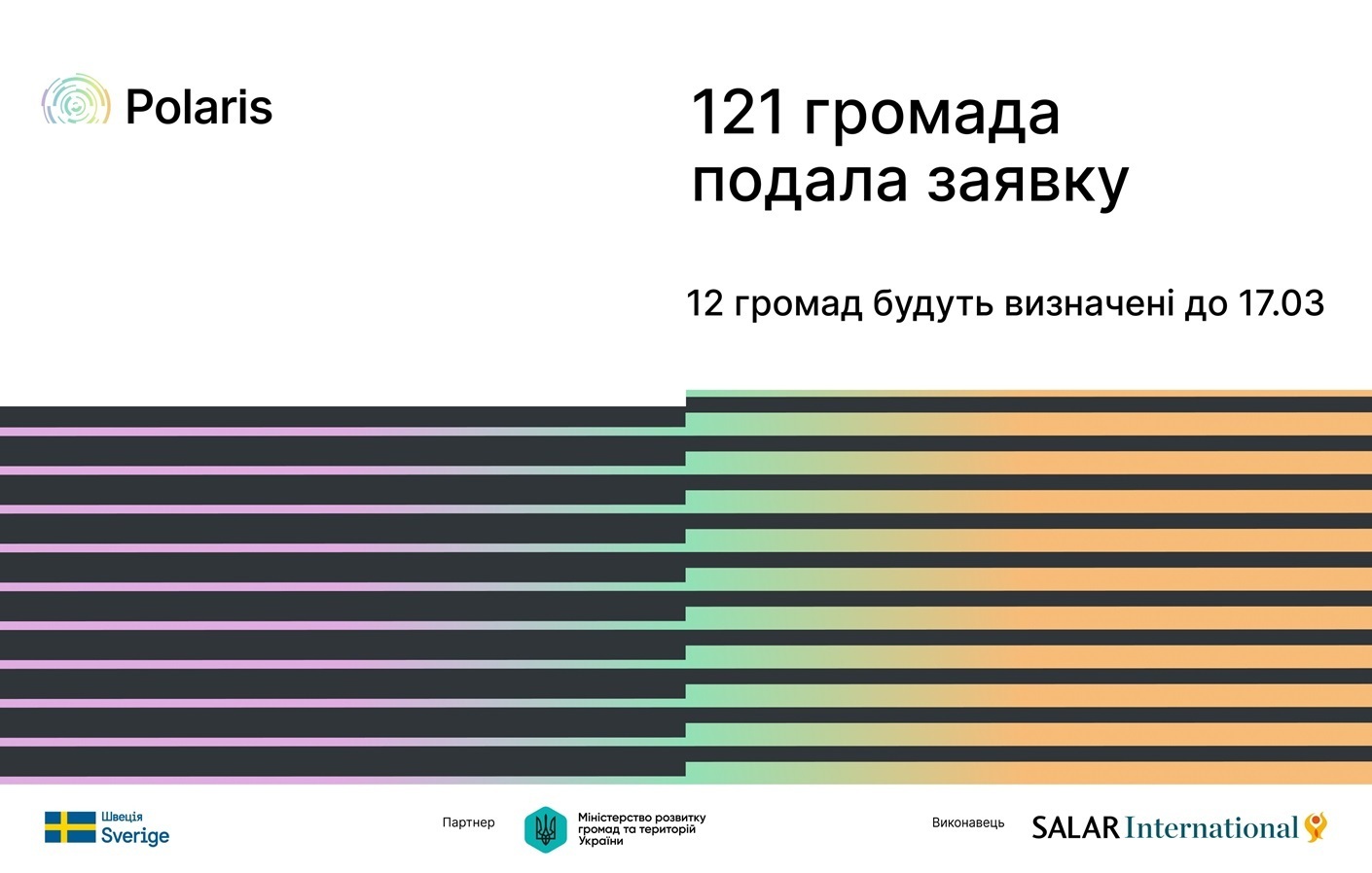 12 громад стануть партнерами шведсько-української програми Polaris «Підтримка багаторівневого врядування в Україні» за напрямом «Відновлення на місцевому рівні». Програма отримала 121 унікальну заявку з 12 областей, для яких був відкритий прийом на вебсайті. Результати будуть оголошені до 17 березня.