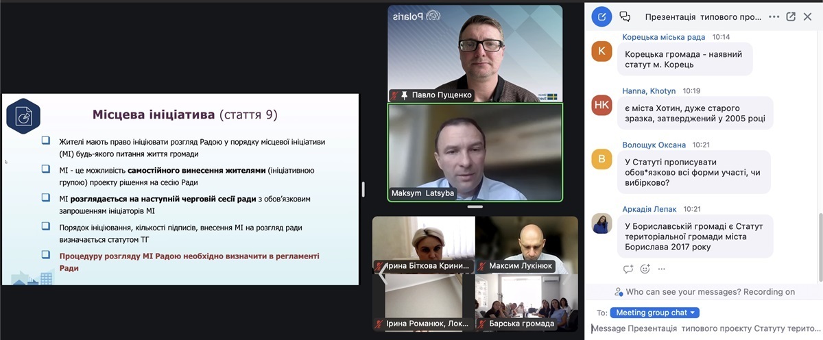 Павло Пущенко, експерт Програми Polaris, представив покрокову дорожню карту розробки індивідуальних проєктів статутів для кожної громади. До кінця липня громади мають:
