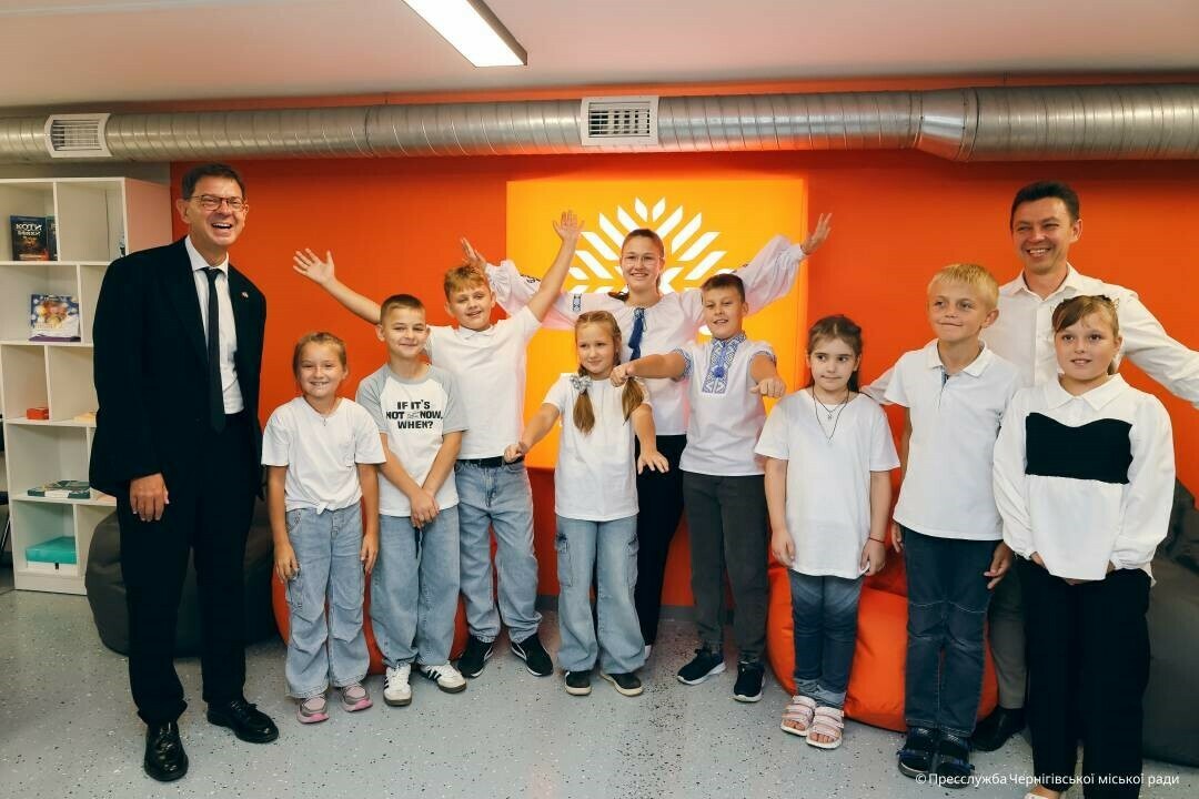 In the photo: Felix Baumann, Ambassador of the Swiss Confederation to Ukraine, Vasyl Bilohura, Head of the Education Department of Chernihiv, and schoolchildren