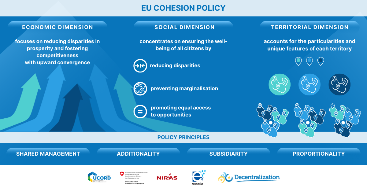 To understand the core terms of the Cohesion policy, it is helpful to begin by outlining its three dimensions, their objectives, indicators, and relevant concepts, which together form the mechanics of the EU's regional policy.