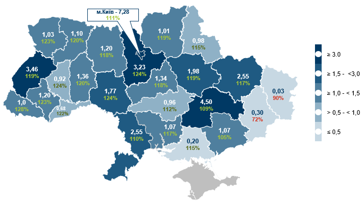 Фактичні надходження податку на нерухоме майно збільшились порівняно з січнем 2025 року на 16,0% до 1,7 млрд грн.[5] Це зростання пов’язане з підвищенням мінімальної заробітної плати, яка станом на 1 січня 2025 року була на 12,7% вищою, ніж роком раніше (мЗП використовується для розрахунку податку для юридичних осіб).[6]