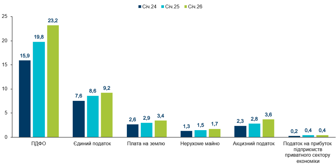 ПДФО традиційно займає найбільшу частку в структурі доходів загального фонду місцевих бюджетів (без трансфертів) – 54,2%. Обсяг надходжень цього податку за січень 2026 року становив 23,2 млрд грн (+17,2% порівняно з січнем 2025 року). Передусім це пов’язано зі зростанням середньої заробітної плати. Згідно з даними work.ua, зарплата з січня 2025 року по січень 2026 року виросла на 22,2% (з 22 500 грн до 27 500 грн). Крім того, з першого січня 2026 року мінімальна заробітна плата виросла на 8,1% (з 8 000 грн до 8 647 грн). За інформацією НБУ, наприкінці 2025 року пропозиція робочих місць зростала швидше, ніж попит на них. Опитування підприємств зафіксували зменшення частки компаній, у яких кількість працівників скоротилася, і поліпшення очікувань щодо найму нових працівників. Однак, дефіцит працівників зберігався, передусім через мобілізаційні та міграційні процеси. Погіршення безпекової ситуації наприкінці року та пом’якшення правил виїзду для молоді призвели до дещо більшого, ніж прогнозувалося, відпливу мігрантів. Усі ці чинники спричинили зростання податкової бази для сплати ПДФО у порівнянні з аналогічним періодом минулого року.