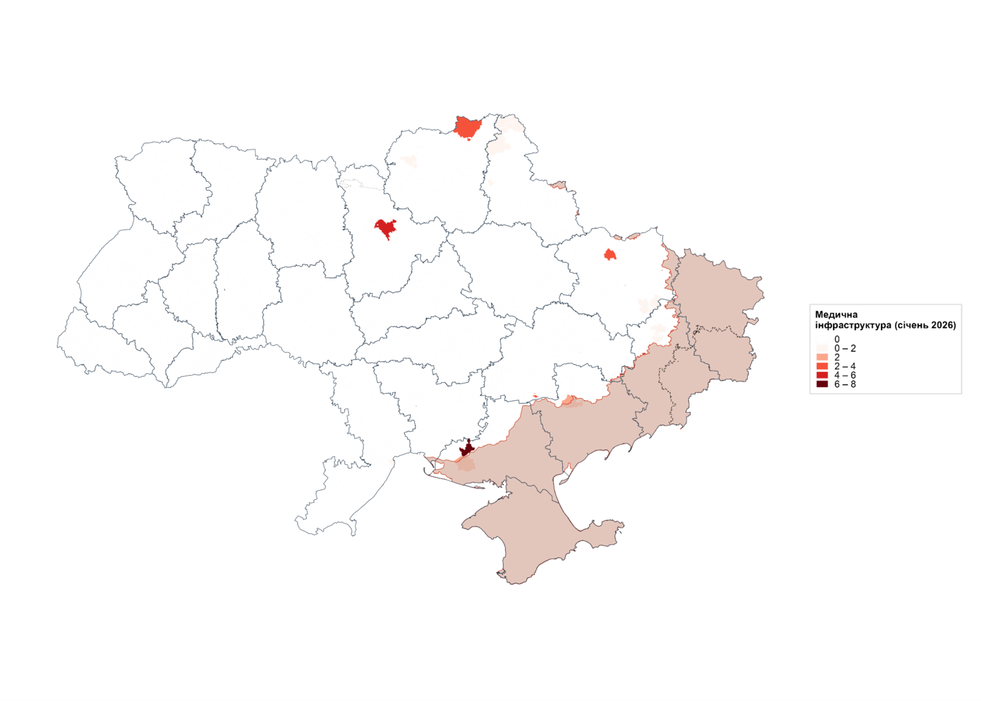 Пошкодження медичної інфраструктури в січні залишалися значними та нерівномірно розподіленими між громадами. Упродовж місяця зафіксовано 37 випадків обстрілів медичних закладів у 20 громадах. Найбільше постраждала Херсонська область – 10 випадків або 27% від загальної кількості, що є найвищим показником серед регіонів і типів інфраструктури. Херсонська громада зазнала 7 ударів, що є найбільшим показником серед усіх громад країни, Київ - 4, а Нікопольська, Харківська та Семенівська громади — по 3 кожна. Водночас у Херсонській області частка пошкоджень, що припадають саме на медичну інфраструктуру, становила 16,7%, що суттєво перевищує середній показник 4,6% по країні і вирізняє регіон на тлі інших областей.